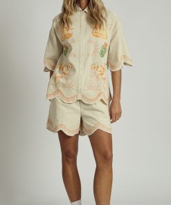 Native Youth Women’s Solstitchery Woven Tops Beach Embroidered Scallop Edge Blouse In White