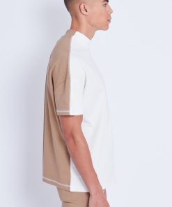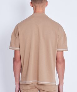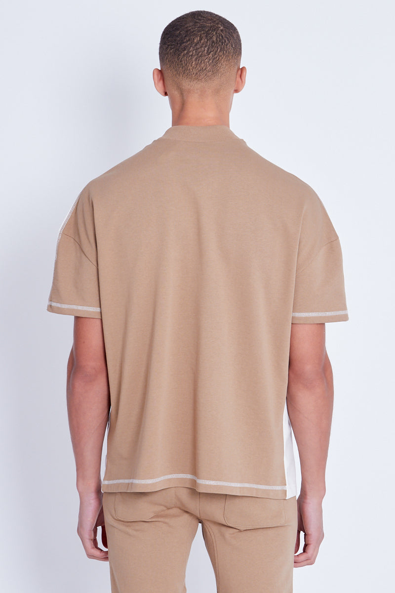 Introducing the Addington, a new take on the casual tee with high mock neck features and a contrast taupe split and stitching.