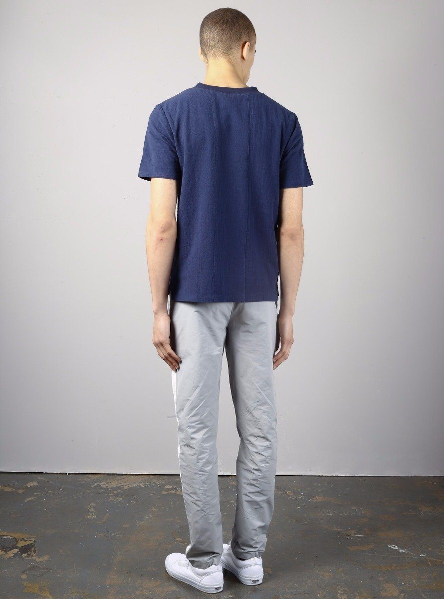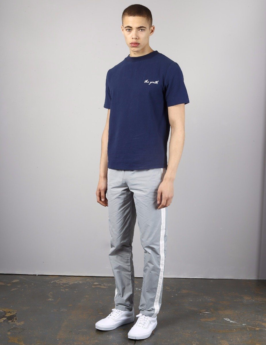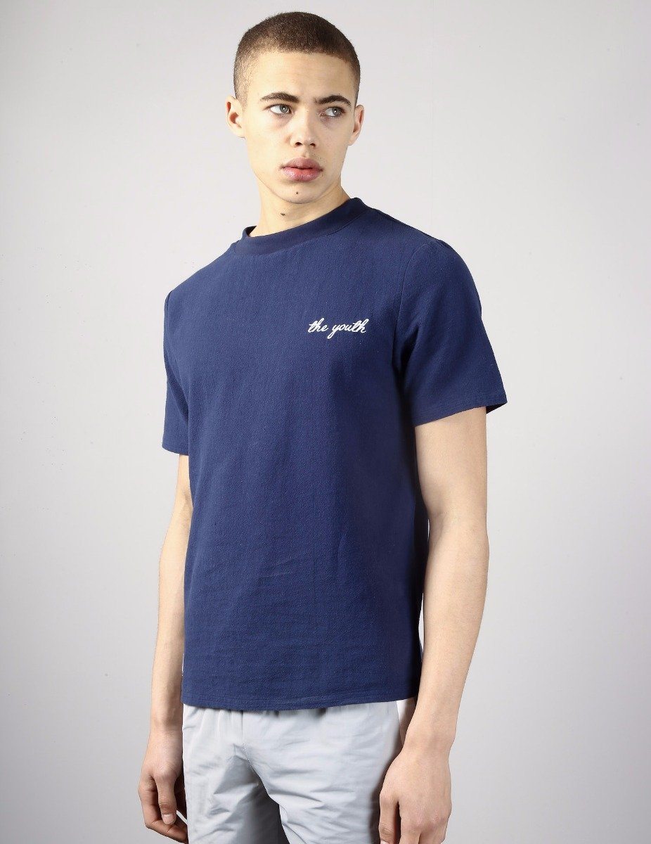 The Broads tee is woven top featuring a contrast jersey rib neck. “The youth” embroidery features on the chest and the tee is cut from a washed cotton fabric.¬†
