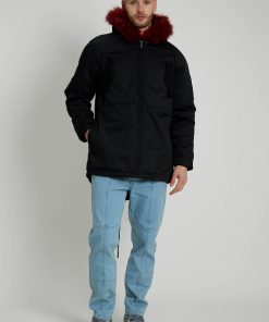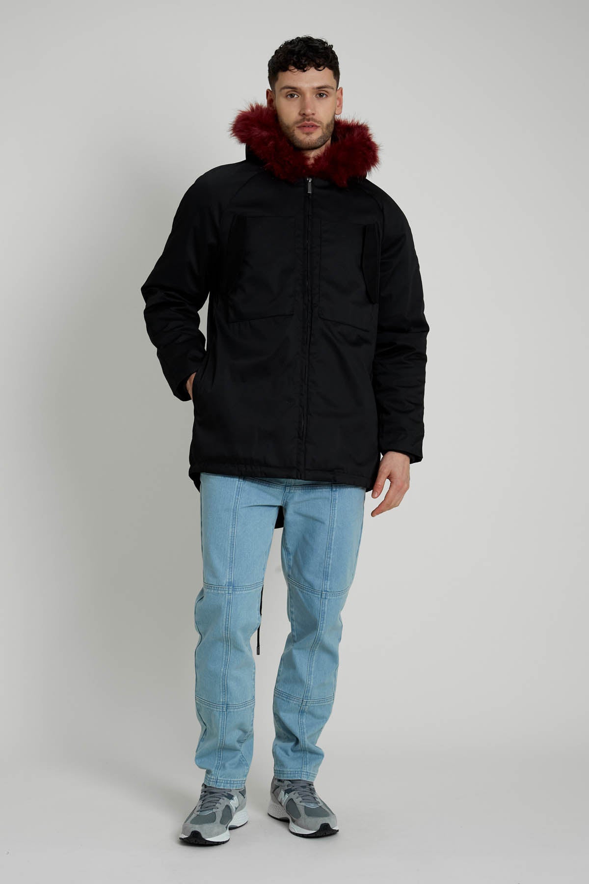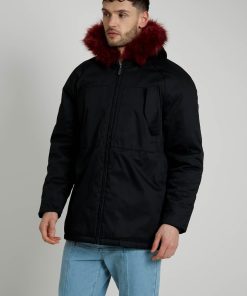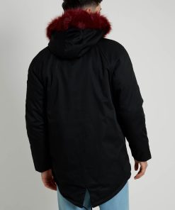 The Ease Parka is a clean parka with contrast sherpa lining and a fur trim. The coat features a burgundy fur hood. The parka is a heavy weight jacket to keep you warm this AW18.