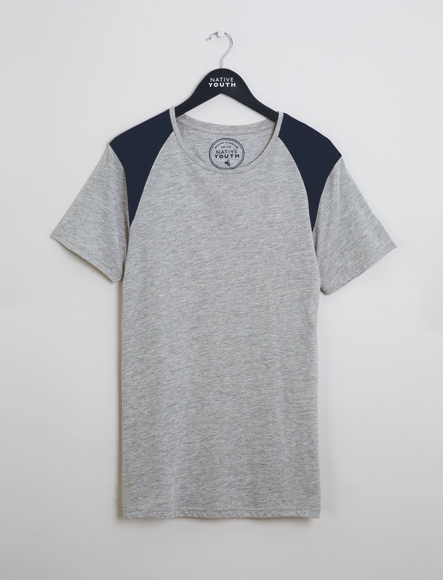 This casual T has contrast colour block shoulder panels. The style is complete with a round neck design and relaxed fit.