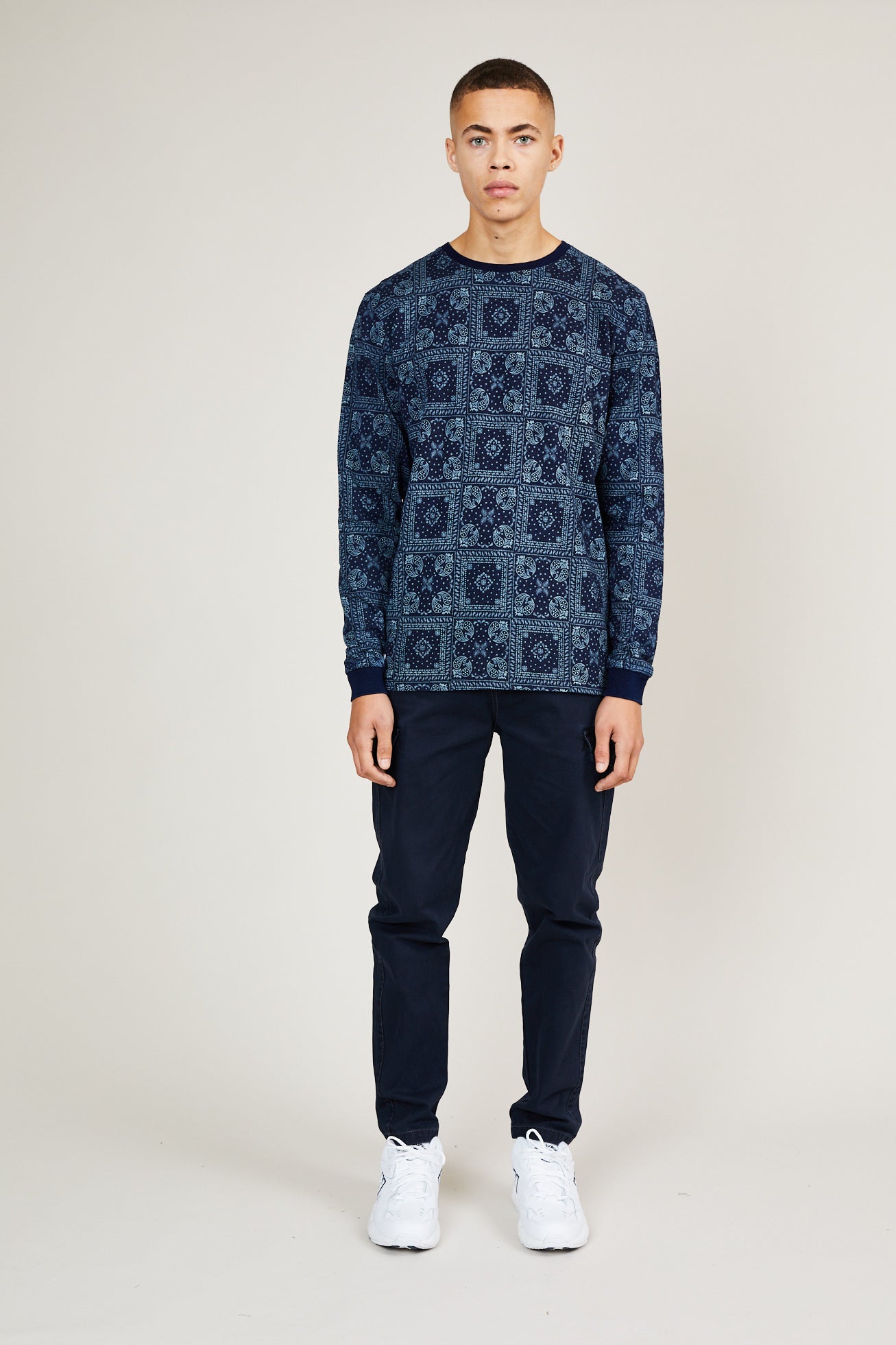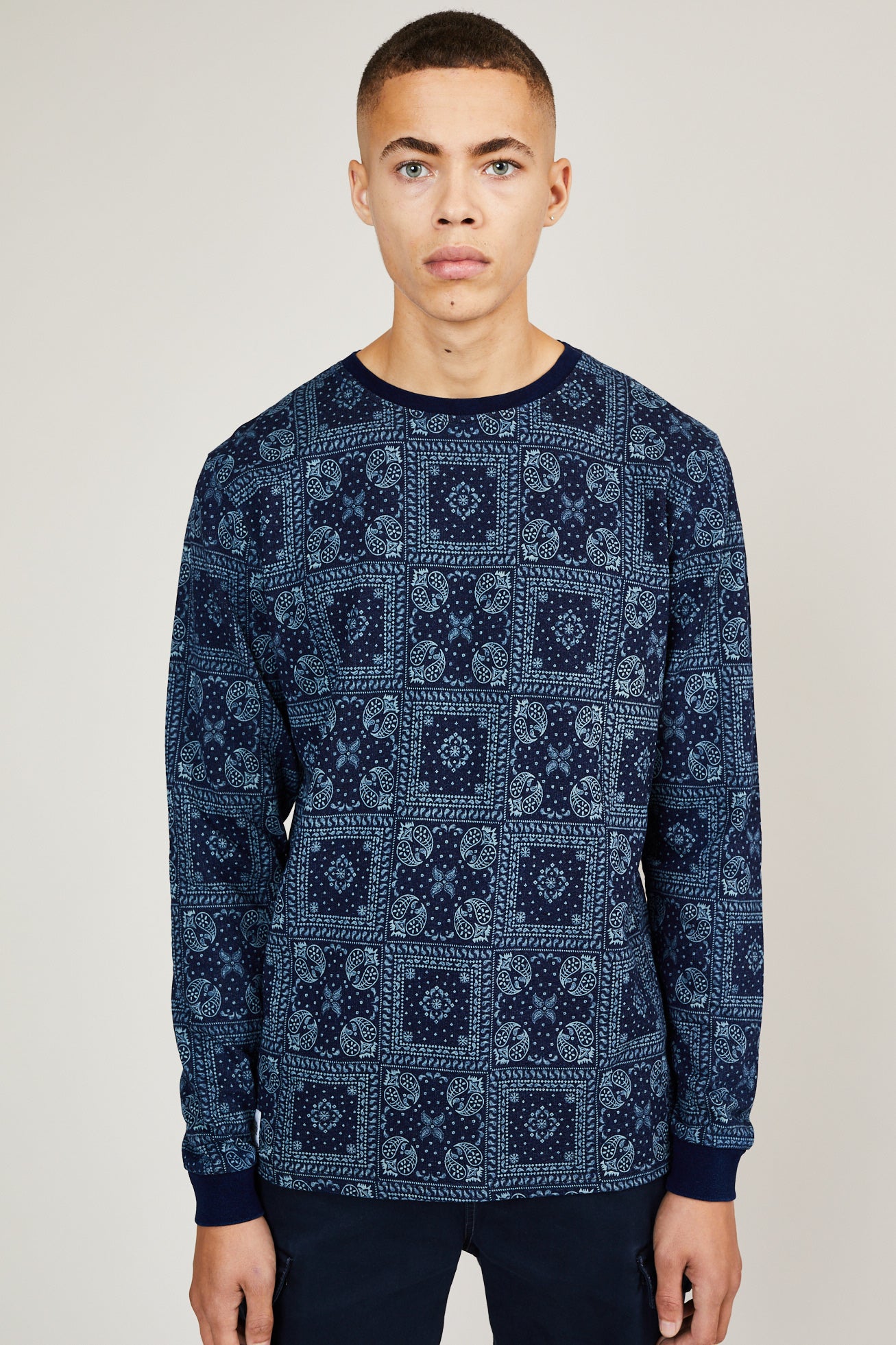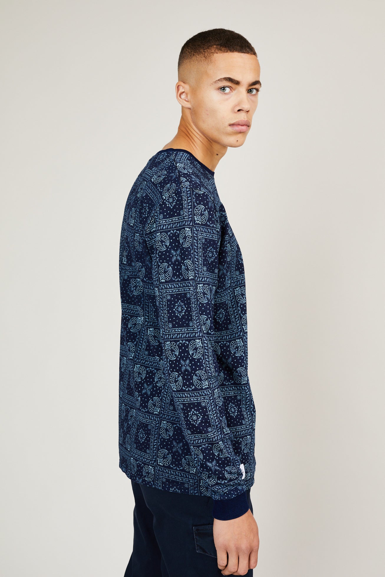 Part of the Kata pack from our AW19 men’s collection, the Kata is a modern crew neck, built using a woven stitch with ribbed cuffs and hems. Made from 100% cotton, this all-over navy crew is a lightweight piece essential for this season.