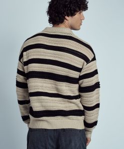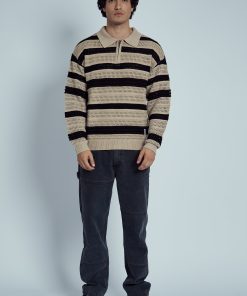 The Meade Knitted Jumper adds casual refinement with its zip polo collar and understated black and stone stripe design. Crafted from 100% acrylic, this relaxed-fit jumper offers warmth and a soft hand feel for daily comfort and style.