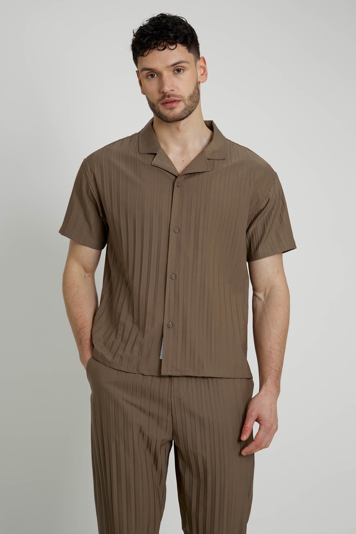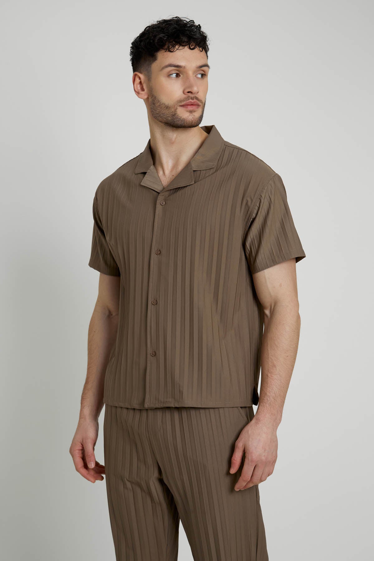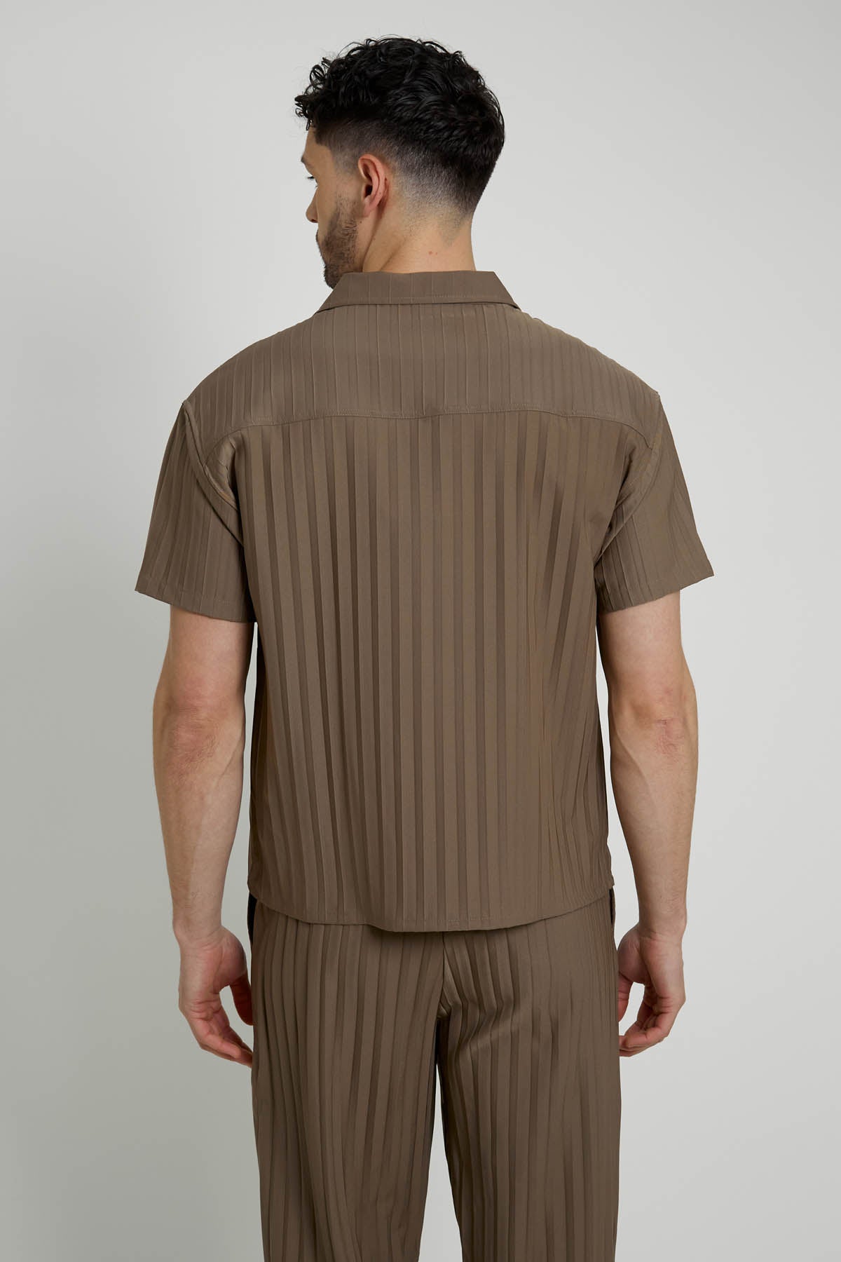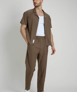 To complete the look, pair this stylish shirt with matching trousers crafted from the same pleated fabric. Together, they create a cohesive and effortlessly chic outfit that is perfect for any occasion, from casual outings to more formal events.