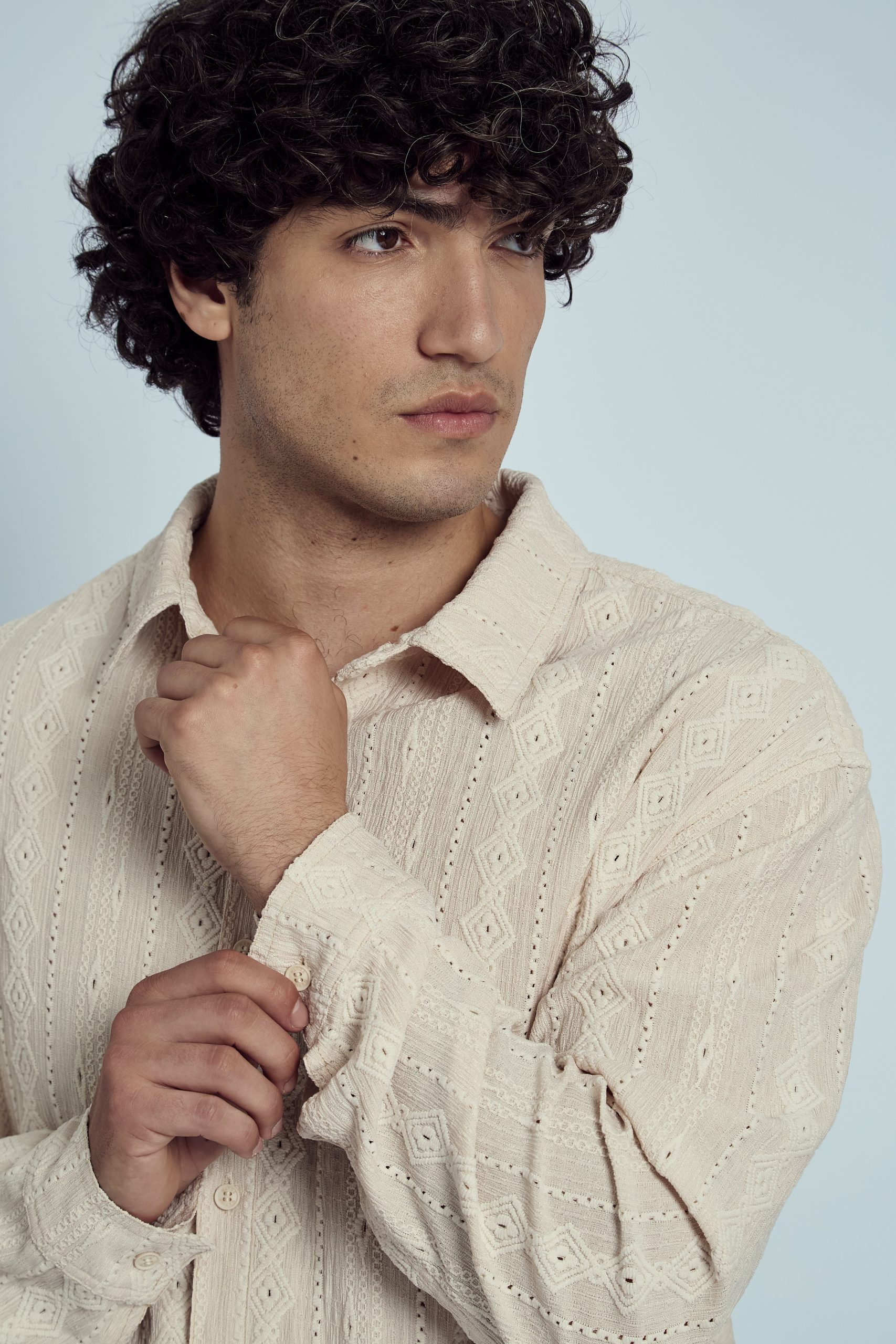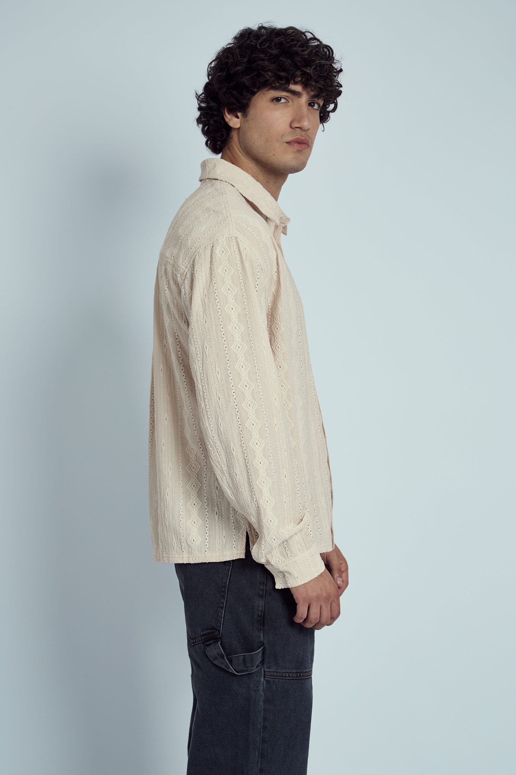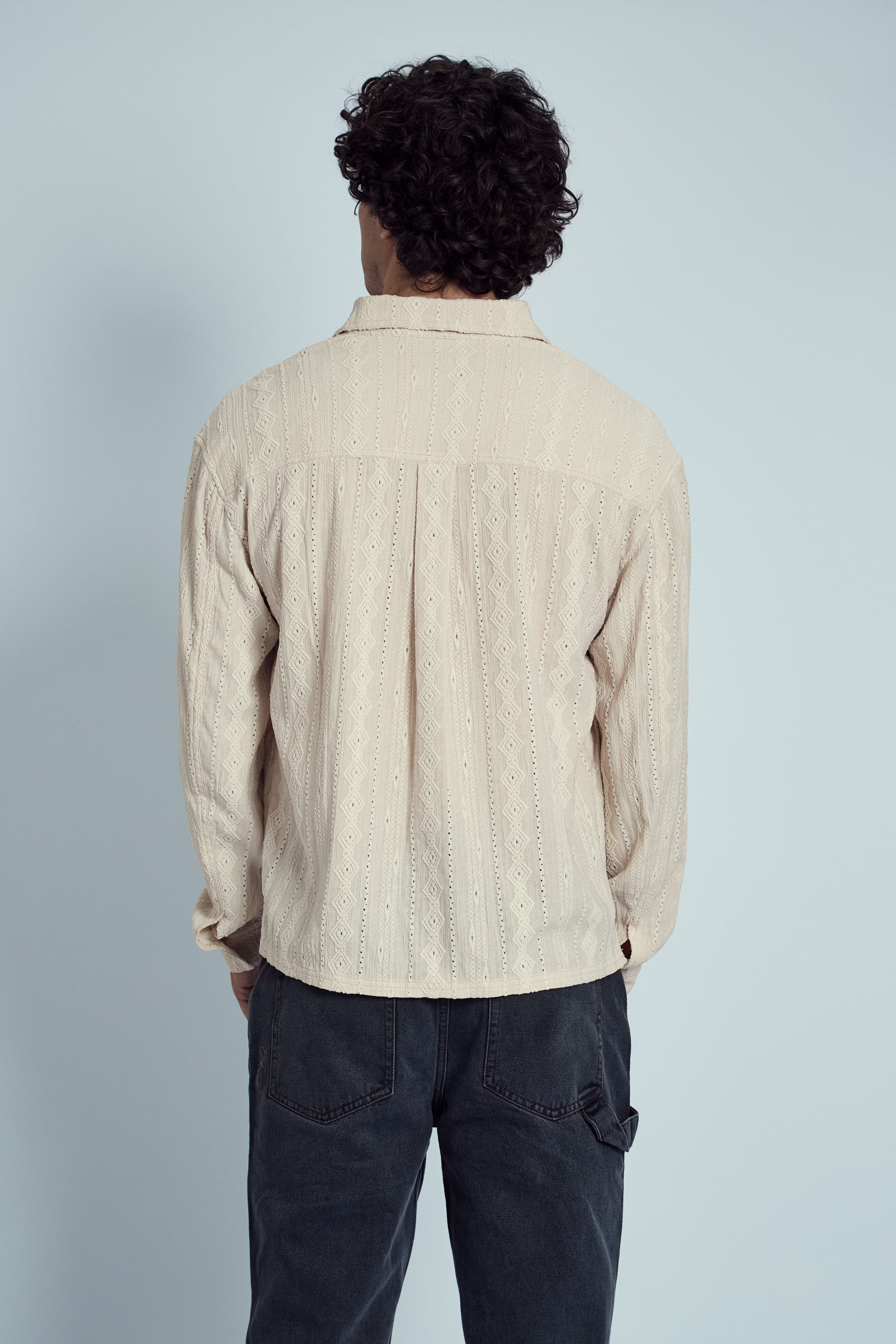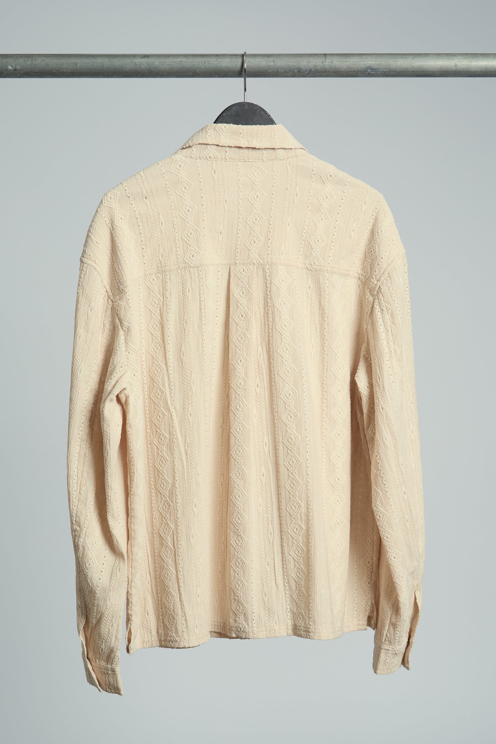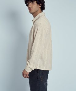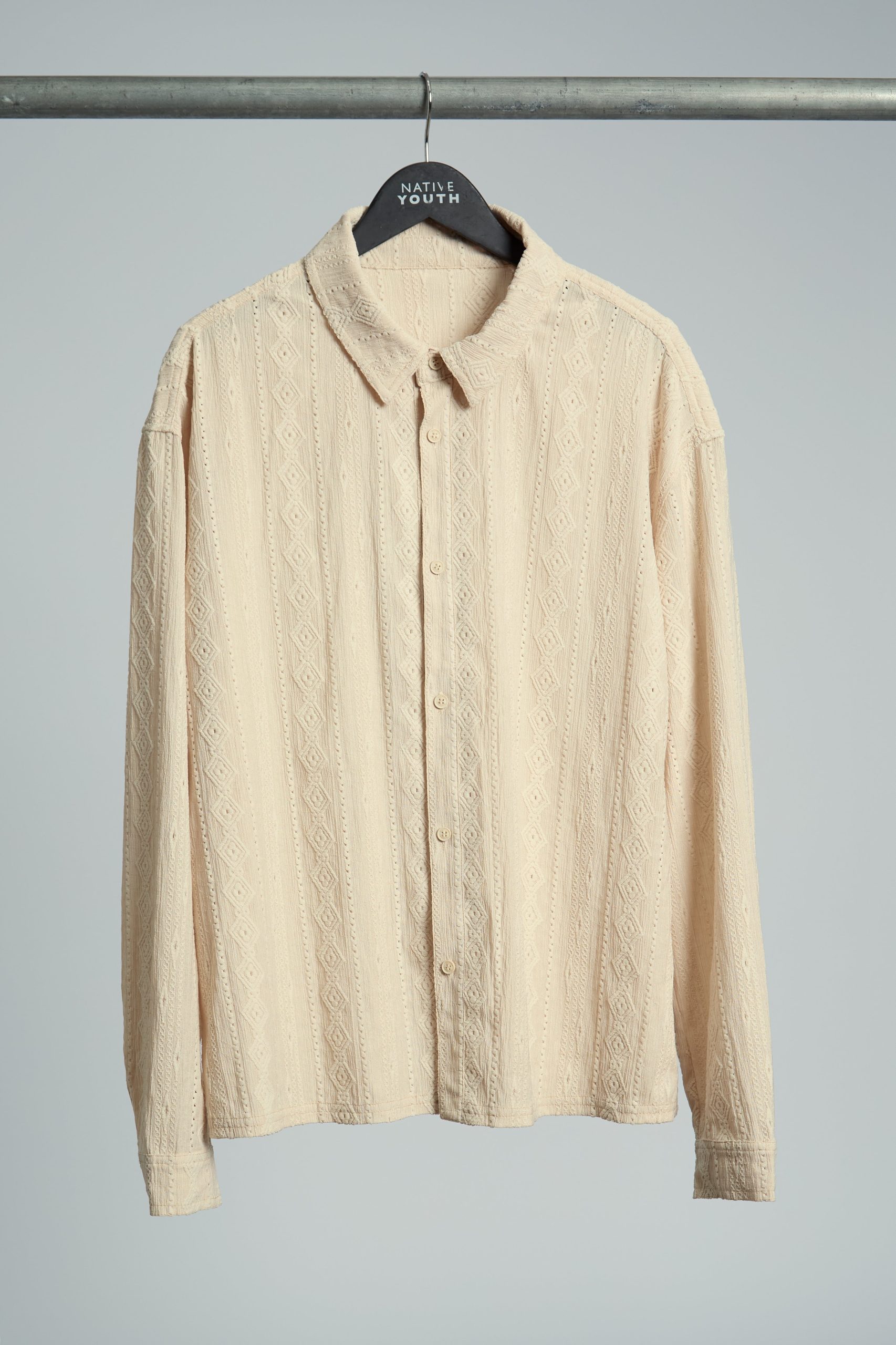 The Morales Jacquard Diamond Stripe Shirt brings a fresh twist to classic shirting with its intricate jacquard diamond stripe pattern. Crafted from a soft blend of polyester and elastane, this long sleeve shirt offers both comfort and subtle stretch. The boxy fit adds a contemporary edge, making it a perfect option for layering or wearing solo.