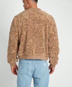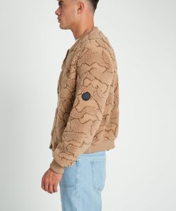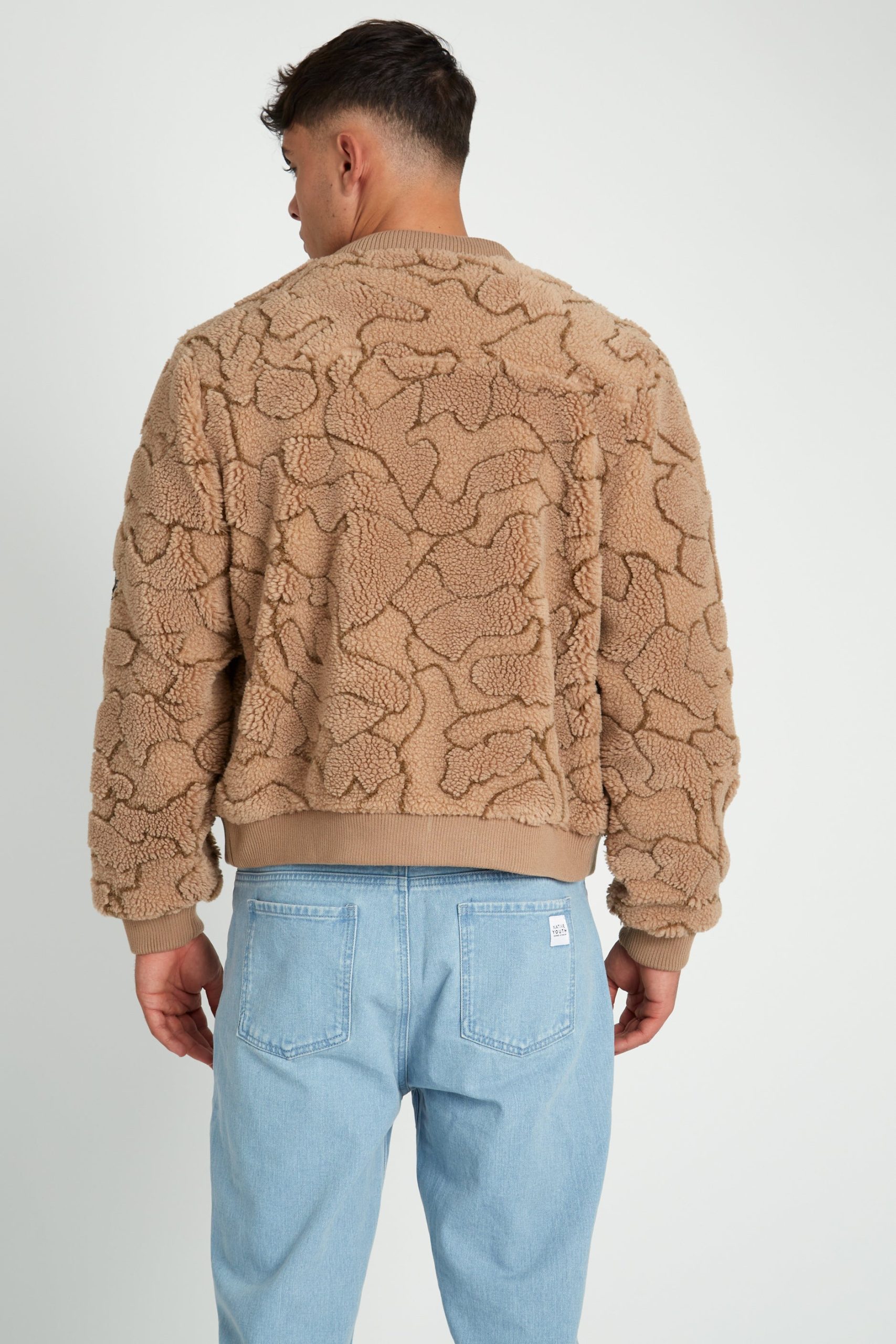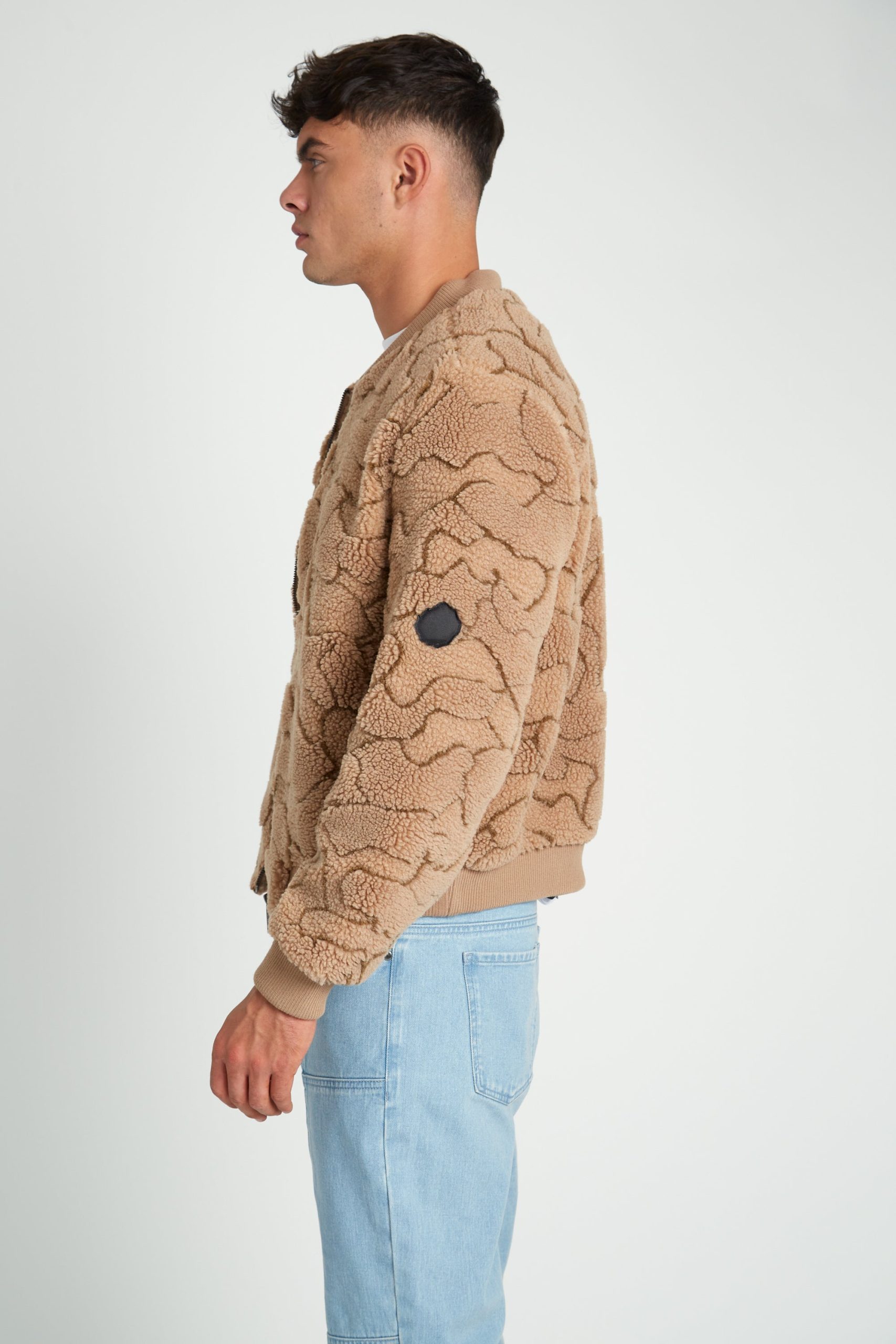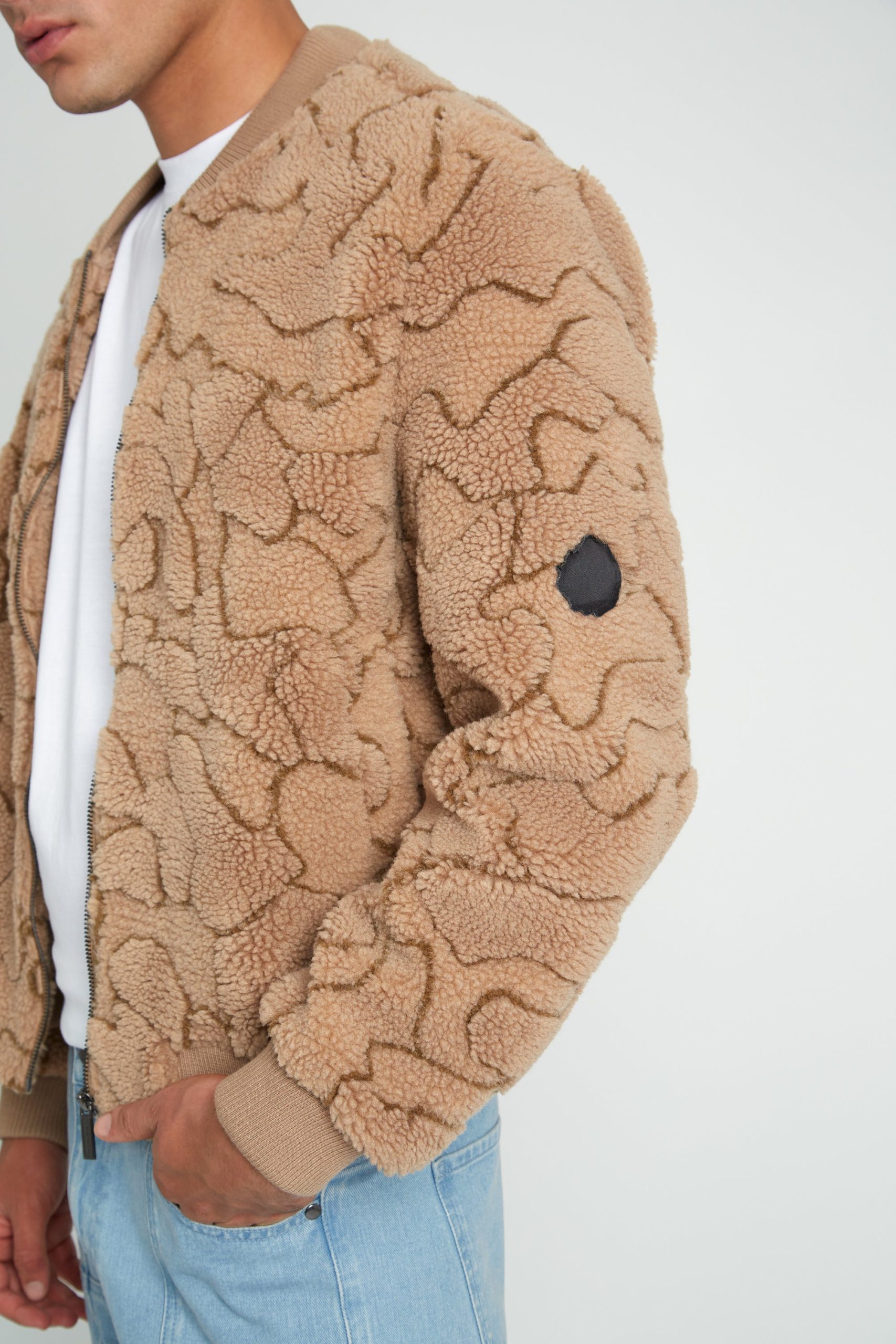 The Stefan bomber jacket is crafted from jacquard borg, showcasing a camouflage style pattern, it features ribbed baseball collar, cuffs and hem.