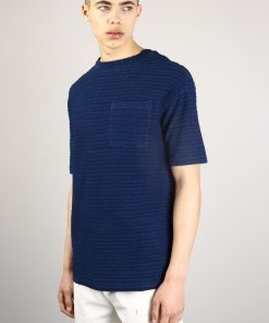 The indigo wash Tidal tee is a boxy fit and features all over jacquard stripe detailing and a chest pocket. Pair with the Marine joggers.
