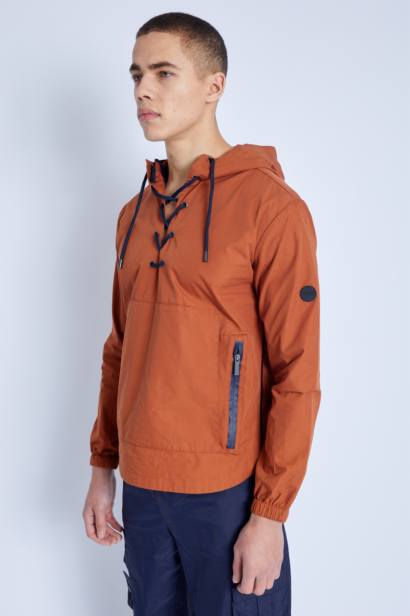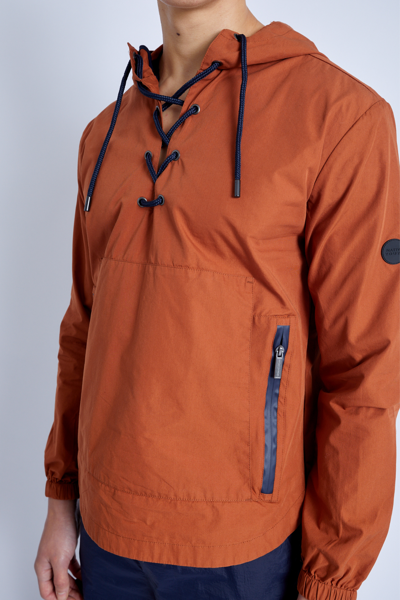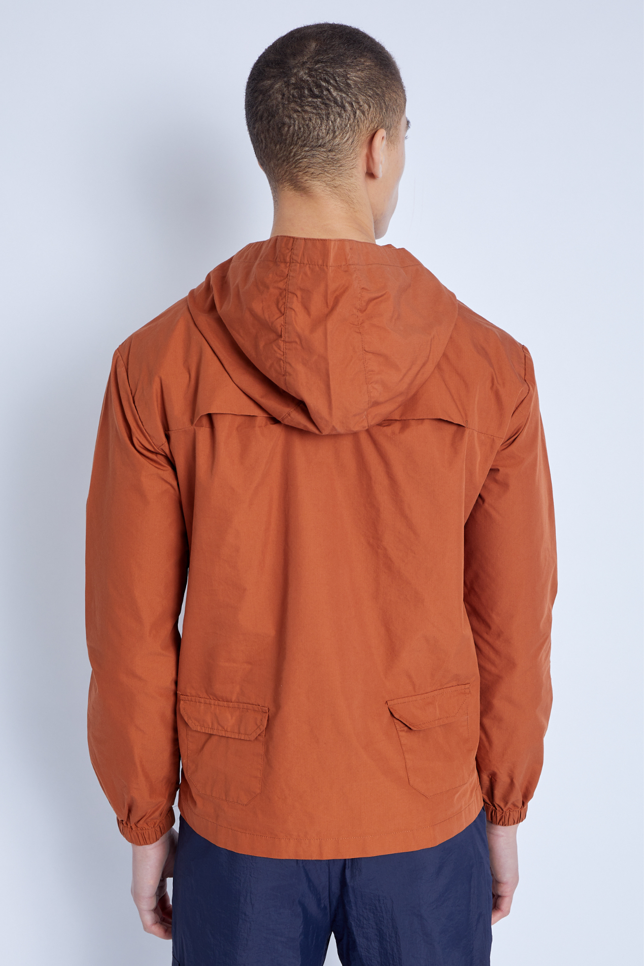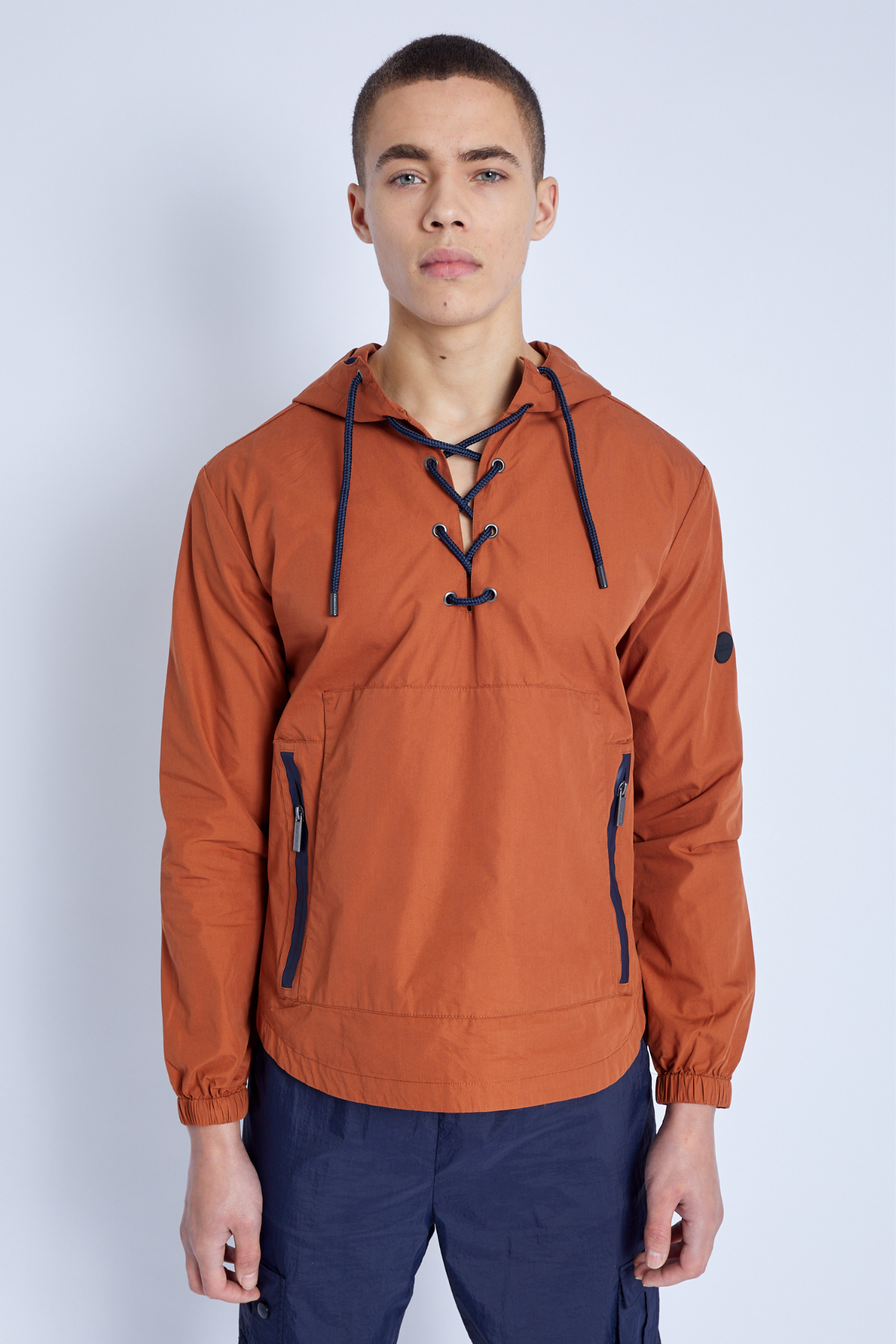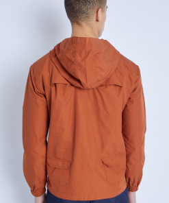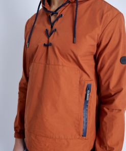This over the head Kagoule jacket features a lace-up neckline and drawstring hood. The orange-toned nylon jacket is the perfect transitional piece for unpredictable weather, complete with zip-side openings for easy wear/removal, double kangaroo pockets, waterproof zip closures, and a back vent across the shoulder to keep you comfortable.