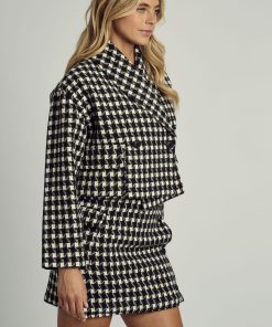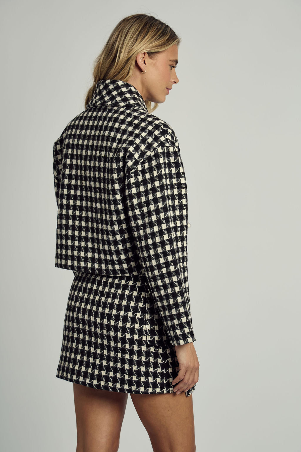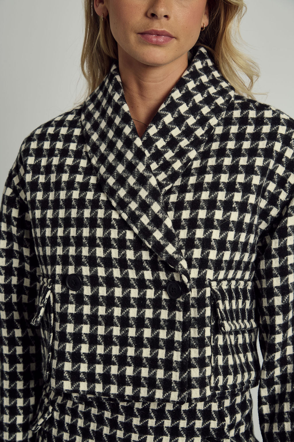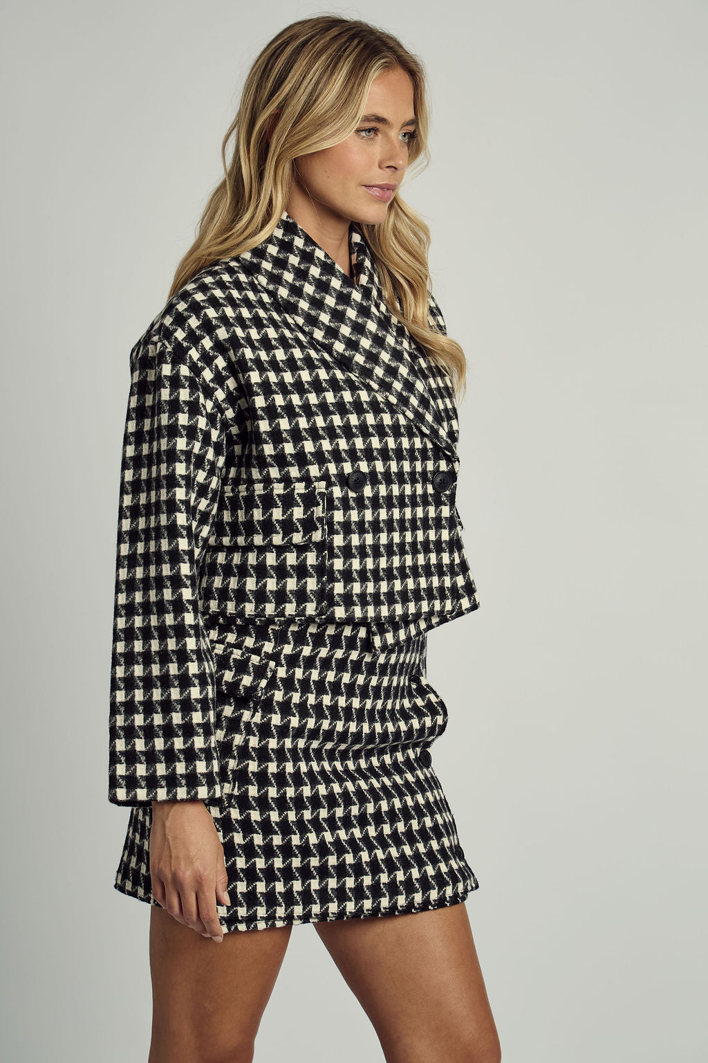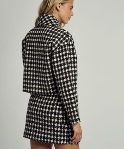 The Ada Jacquard Check Cropped Jacket in black and white brings bold patterning and cozy warmth to a contemporary, cropped silhouette. Crafted with a premium jacquard check fabric, this piece combines style and sophistication, adding a refined touch to your winter layering essentials.