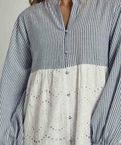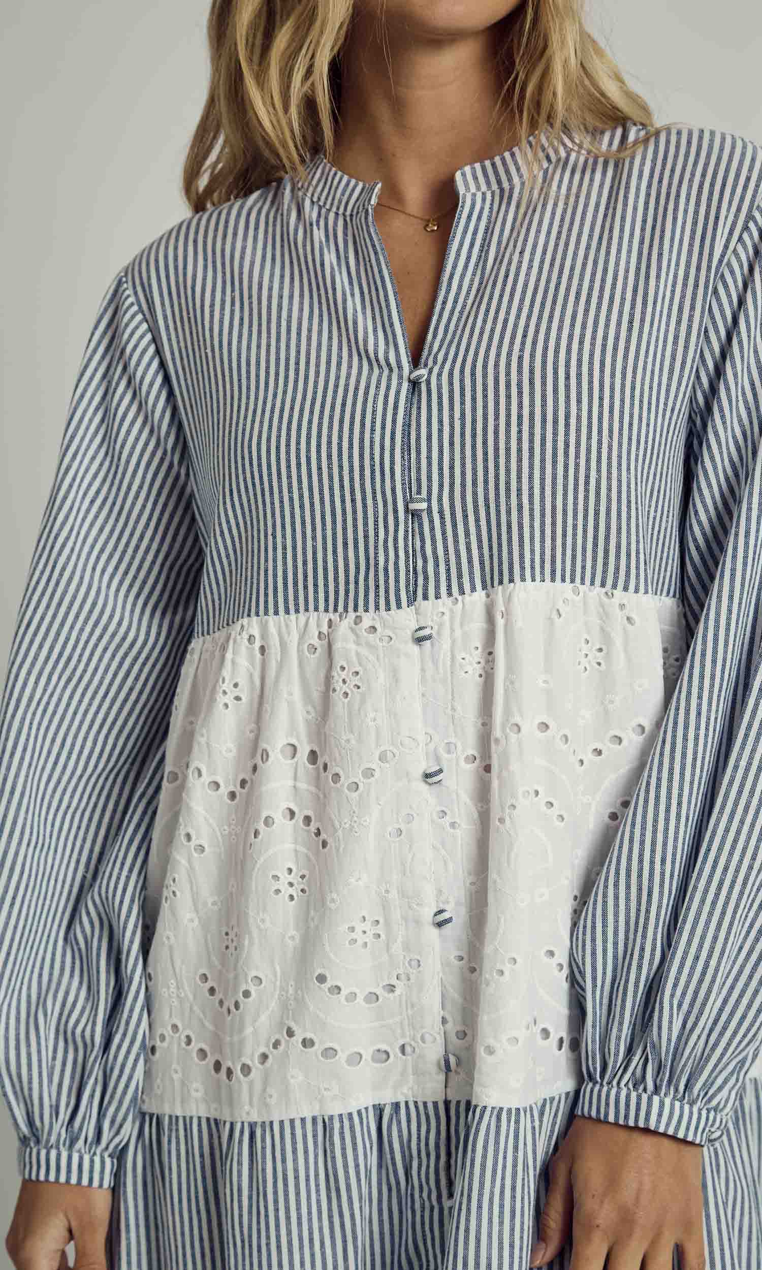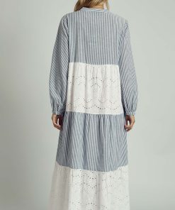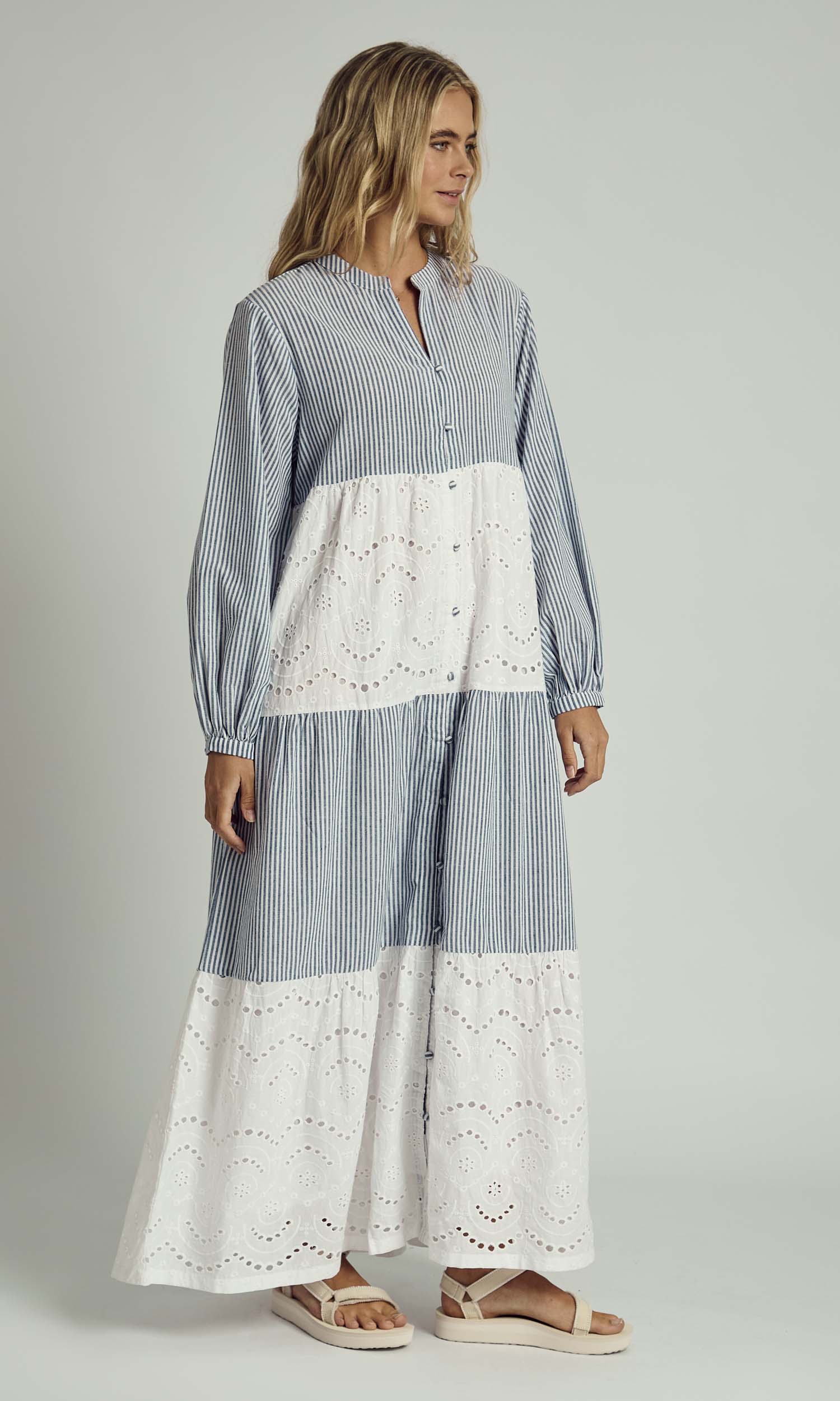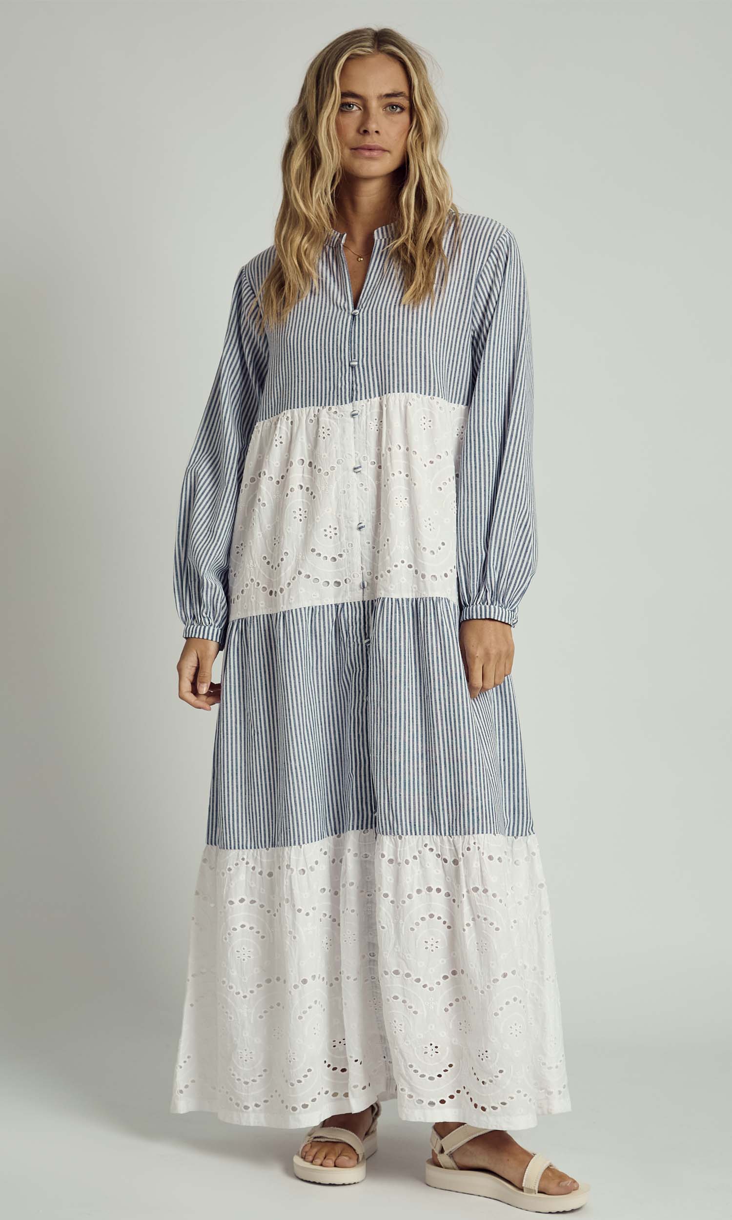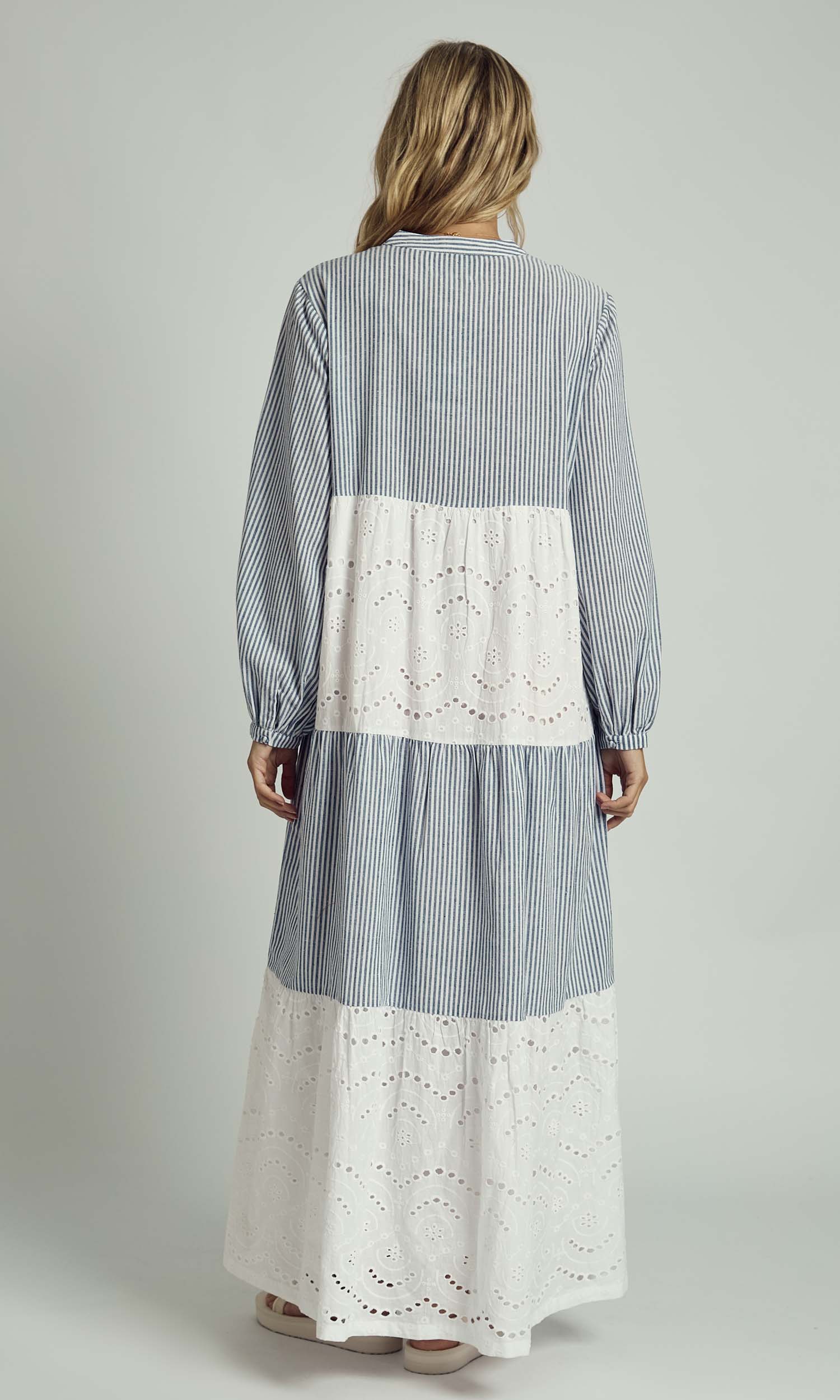 A perfect blend of relaxed charm and intricate detail, this maxi smock dress features contrast broderie inserts and soft blue stripes for a timeless, easygoing look. Designed with a flowy tiered silhouette, it moves beautifully with you from day to night.