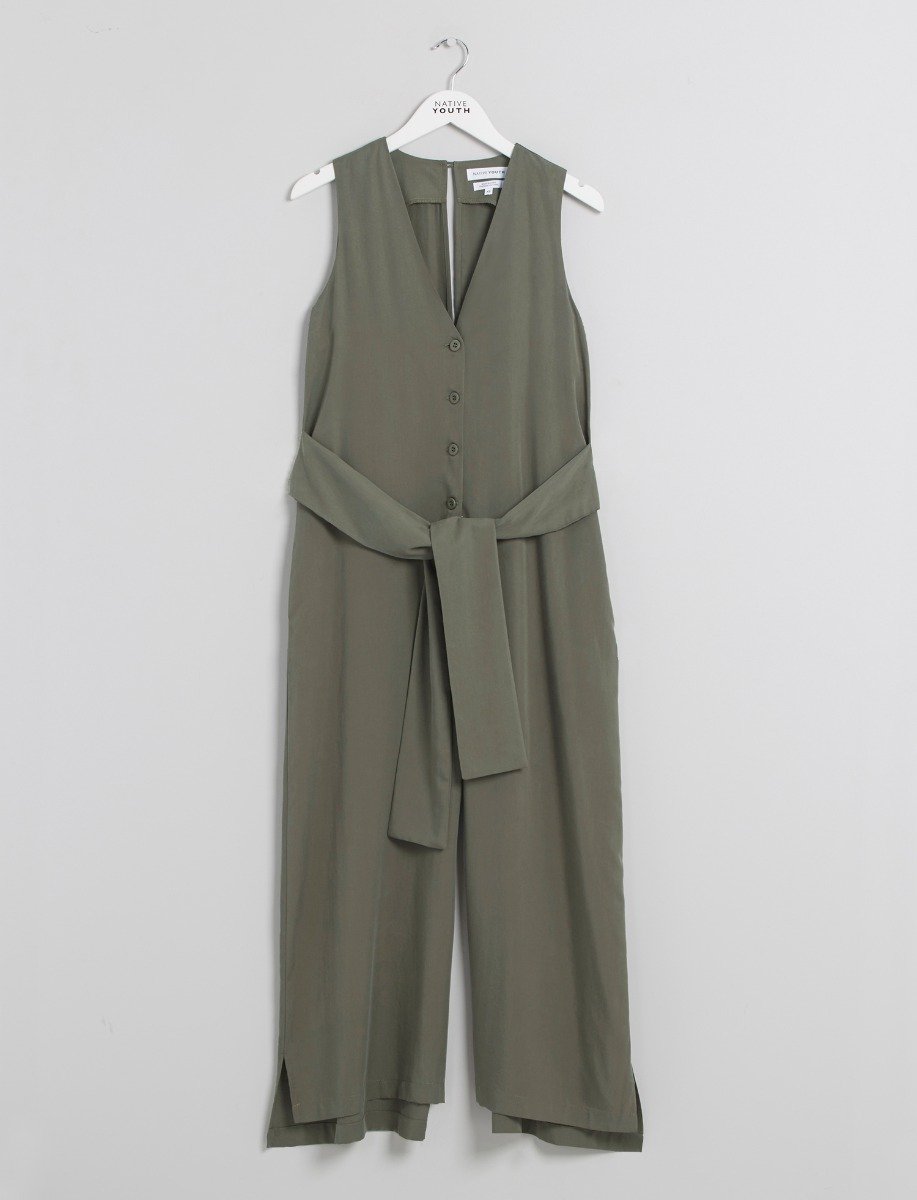 Introducing the Aster pack for AW17. The Aster pack is an all olive coloured collection of tencel designed pieces which includes a shirt, a corresponding pant and a jumpsuit. The Aster Jumpsuit is an earthy coloured piece and features a front button fastening and tie waist detail, as well as having wide legs and a side split on the trouser hem.