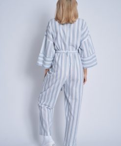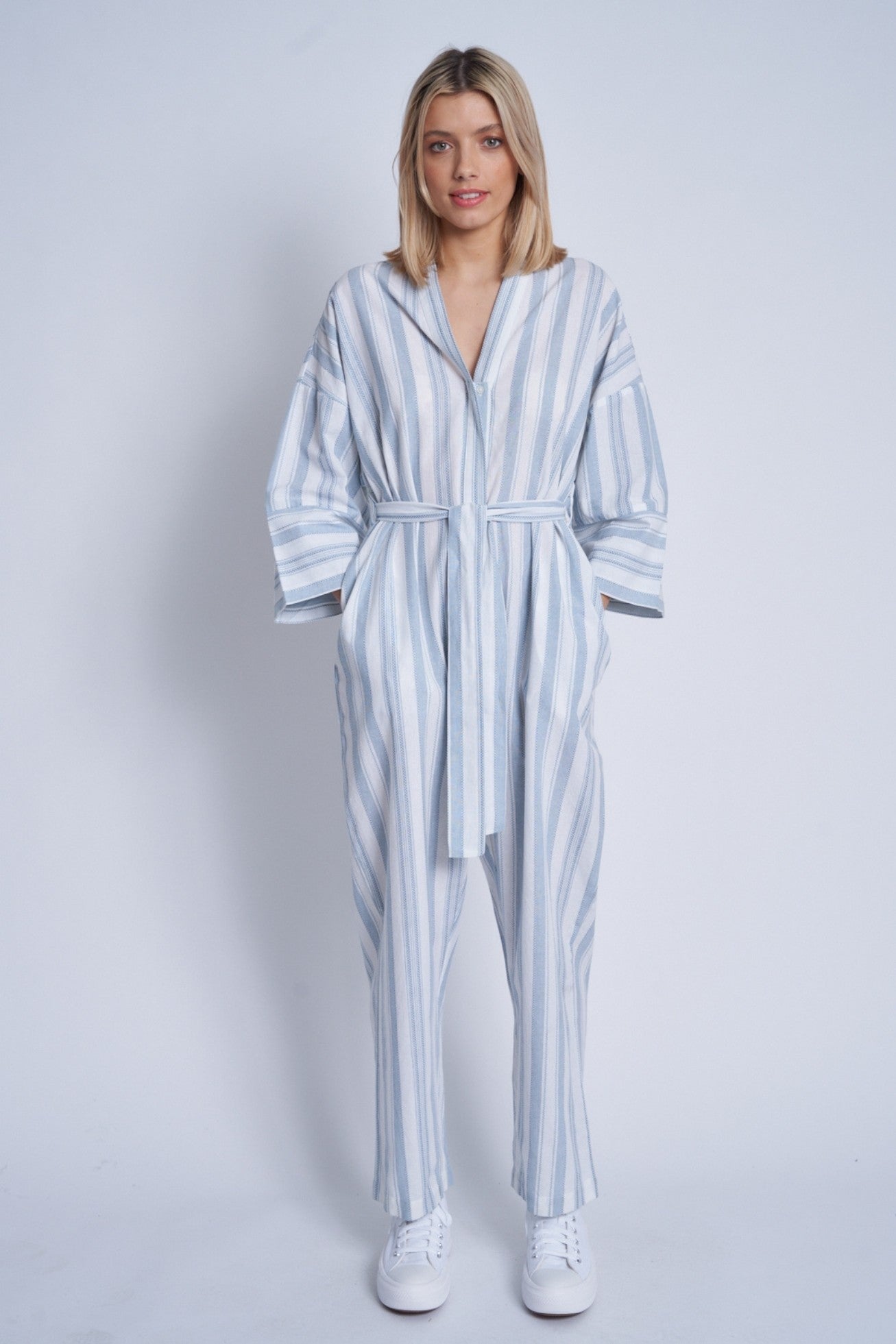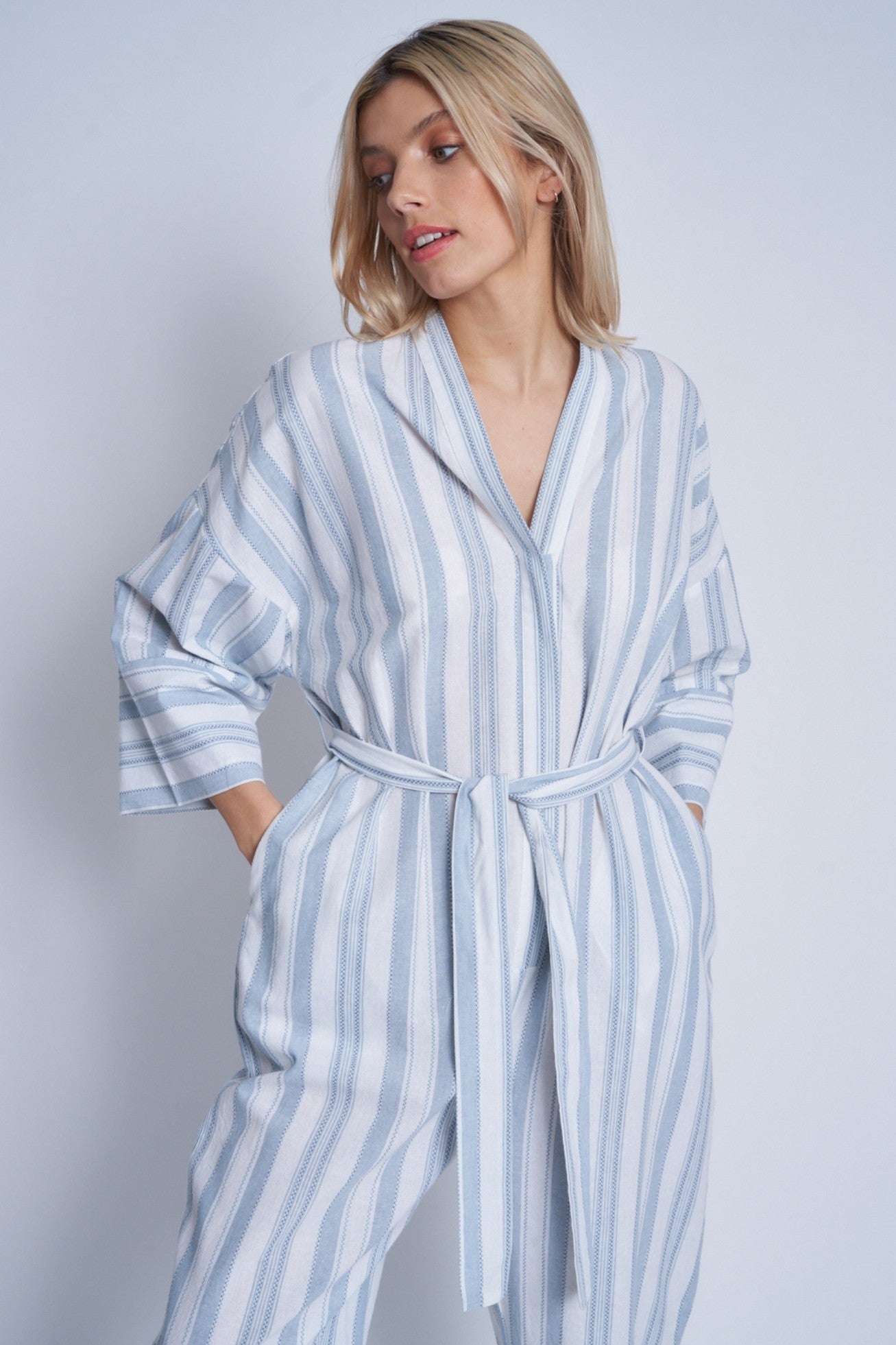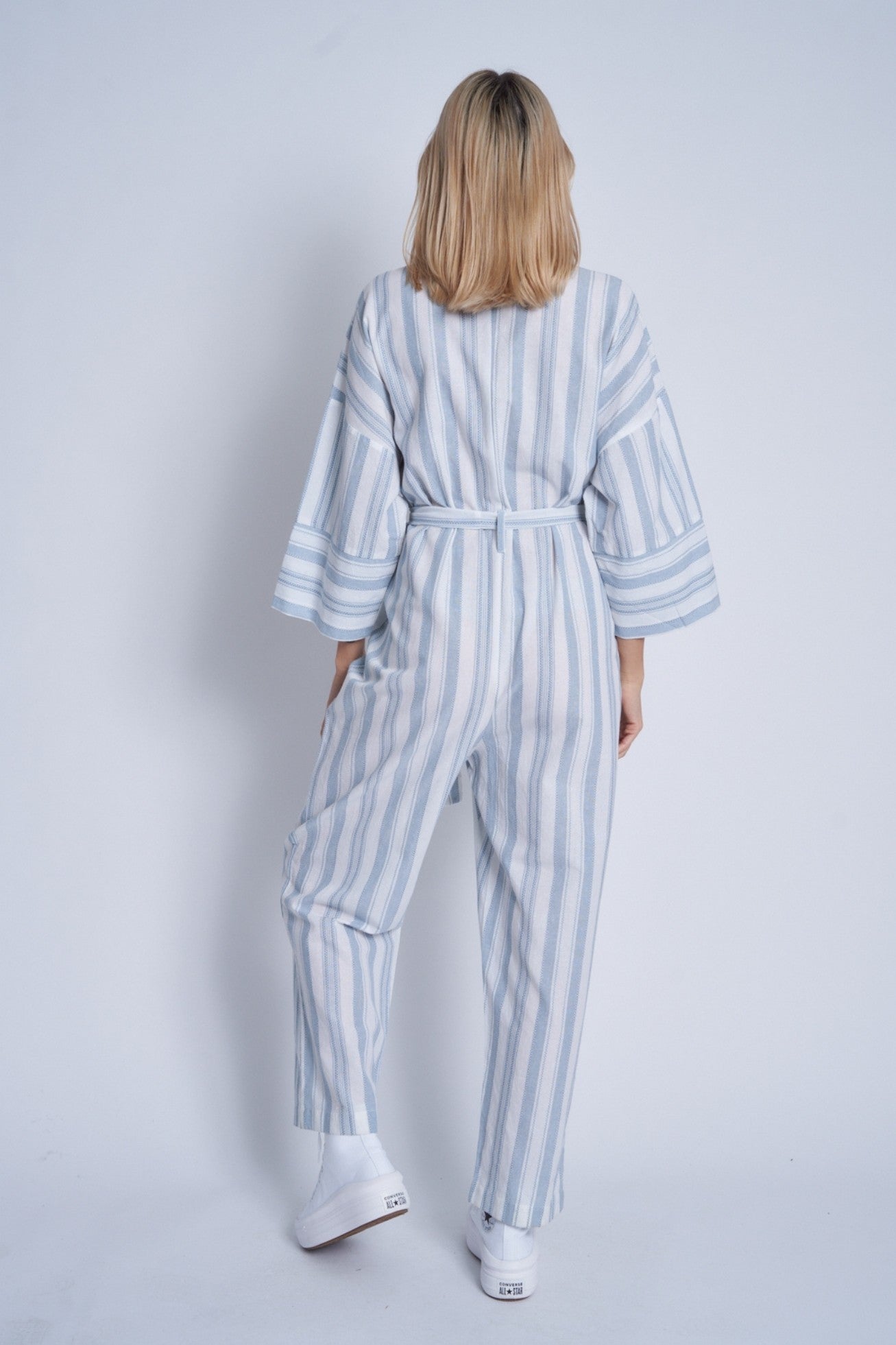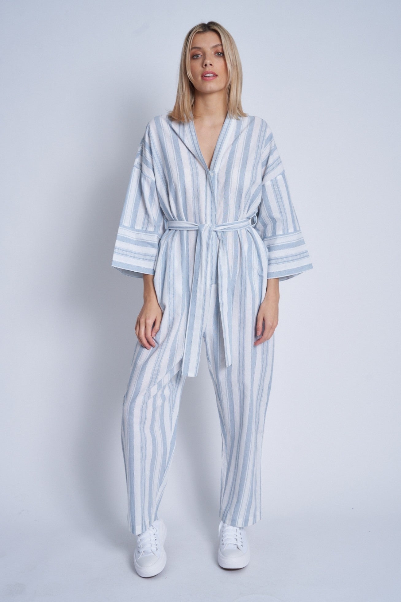 Introducing the Cada Jumpsuit comes in an all-over textured linen mix stripe with wide kimono sleeves. Finished with slip side pockets and a tie waist.
