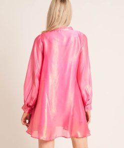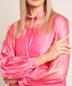 The Circe trapeze dress features mandarin collar with tie detail, scoop neck and voluminous blouson sleeve.