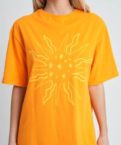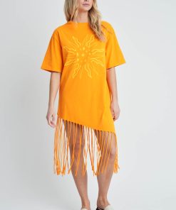 Introducing the Daia dress, constructed from 100% cotton fabric. It has a crew neck, short sleeves and an asymettric tassel hem that distinguish it from other styles. The chest displays a printed graphic for a distinctive touch