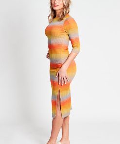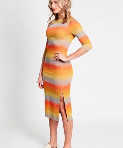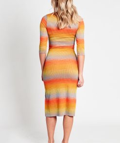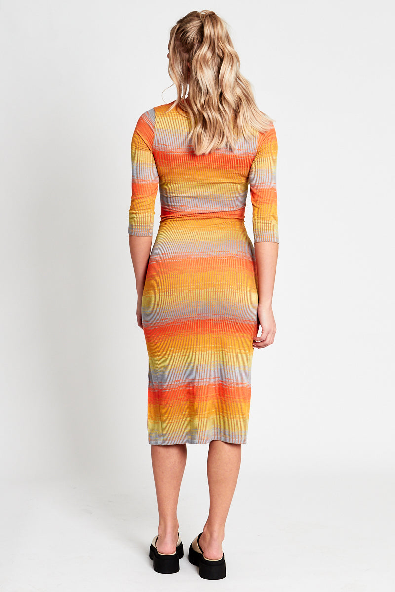 Introducing the Dionne Dress, coming in our signature sunset ombre design of the season in a ribbed jersey material, to create a sunset-inspired close-fitting midi dress.