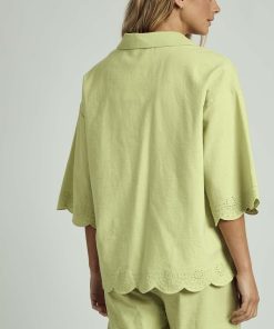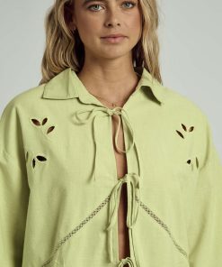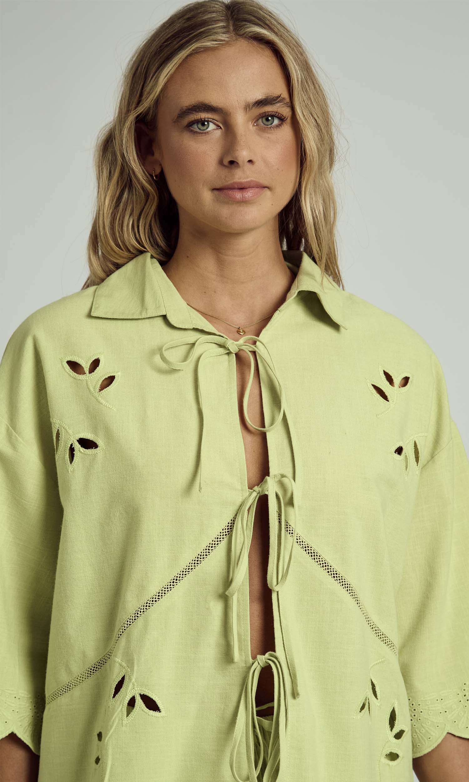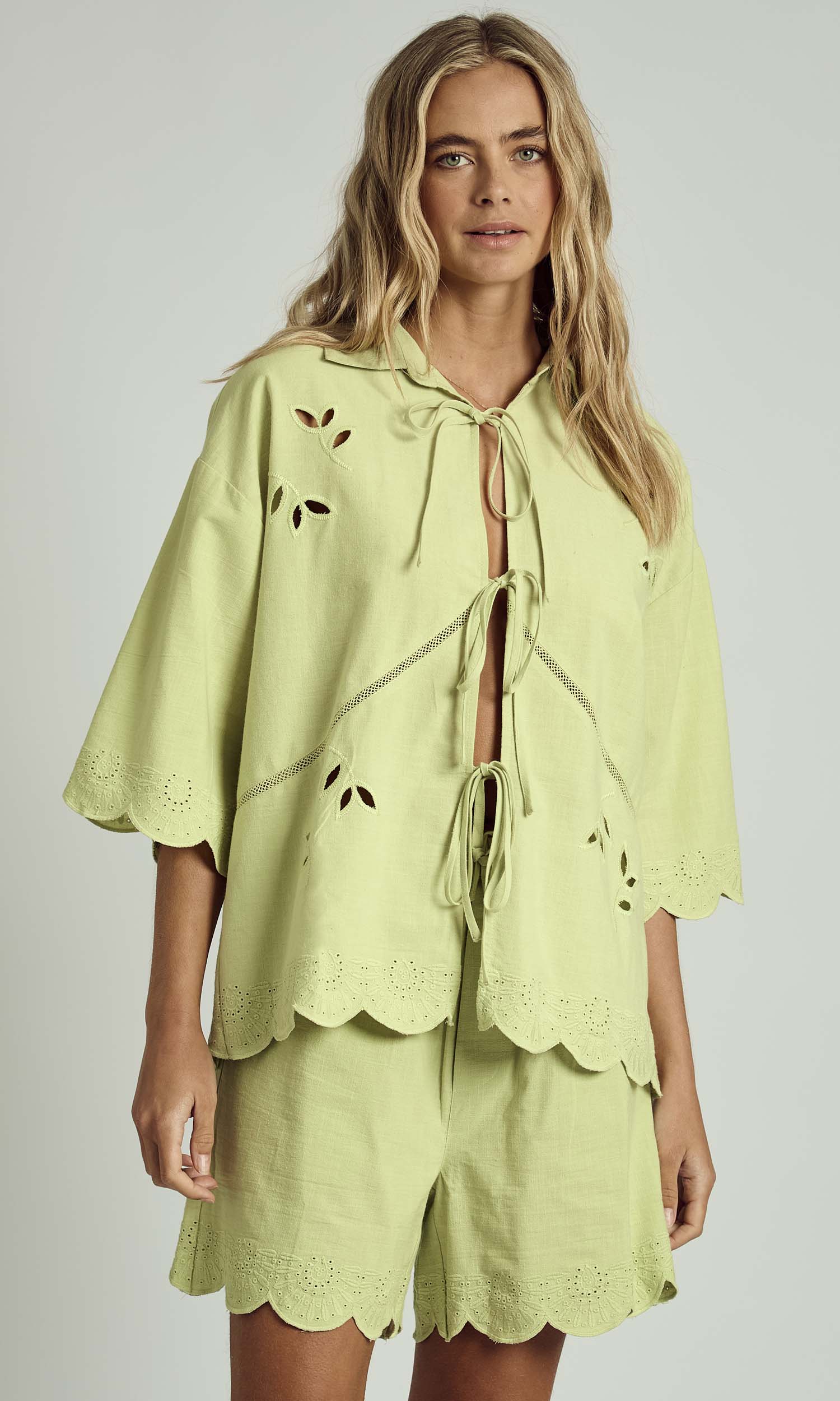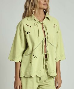 Elevate your wardrobe with the Native Youth Scallop Edge Tie Detail Blouse, designed in a soft sage green hue. Featuring delicate cutwork embroidery and elegant scallop-edge detailing, this blouse brings a refined yet effortless charm to any outfit. The tie detail adds a subtle touch of femininity, making it perfect for both casual and dressy occasions. Crafted from lightweight fabric for breathable comfort, pair it with matching co-ords or your favourite denim for a chic, everyday look.
