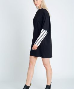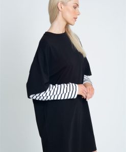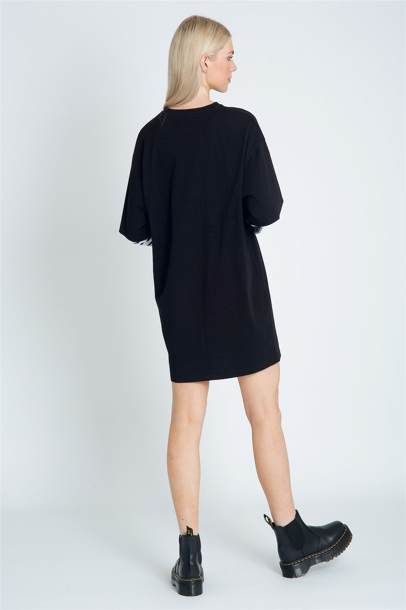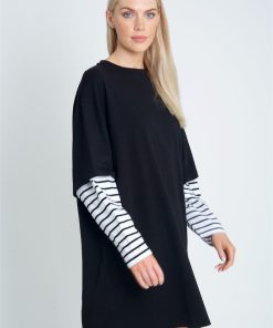 Introducing the Freya, an oversized drop-shoulder t-shirt dress in a boxy silhouette, with layered two-in-one stripe features.