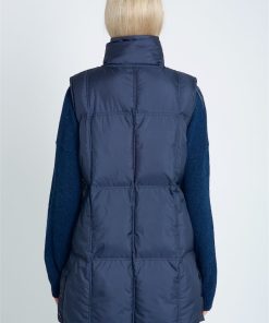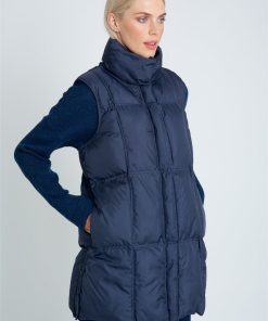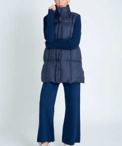 Introducing the Gianna, a timeless navy gilet constructed in a longline length with a padded button-up outer and funnel neck details. Wear it open or closed layered over your favourite matching set