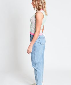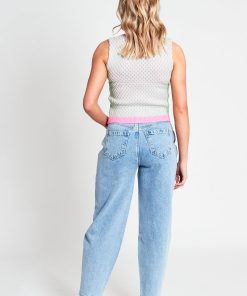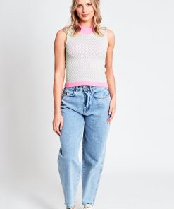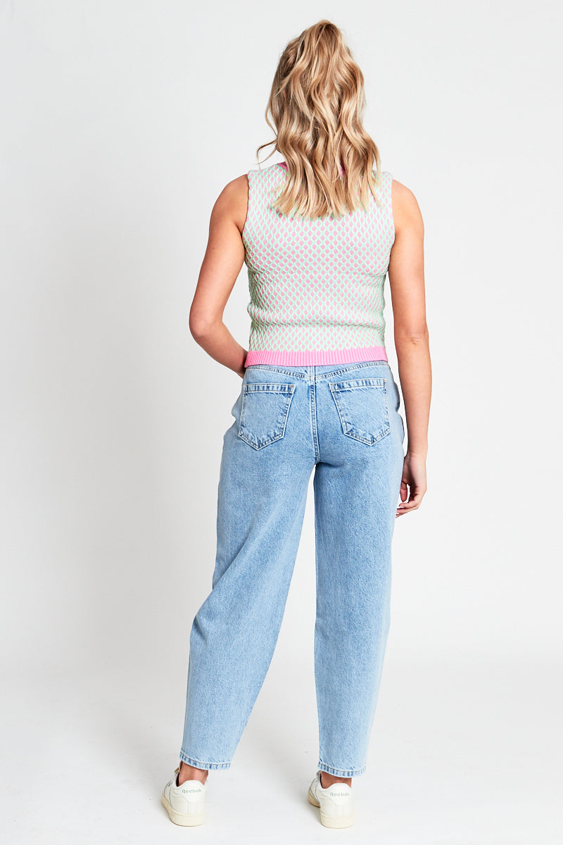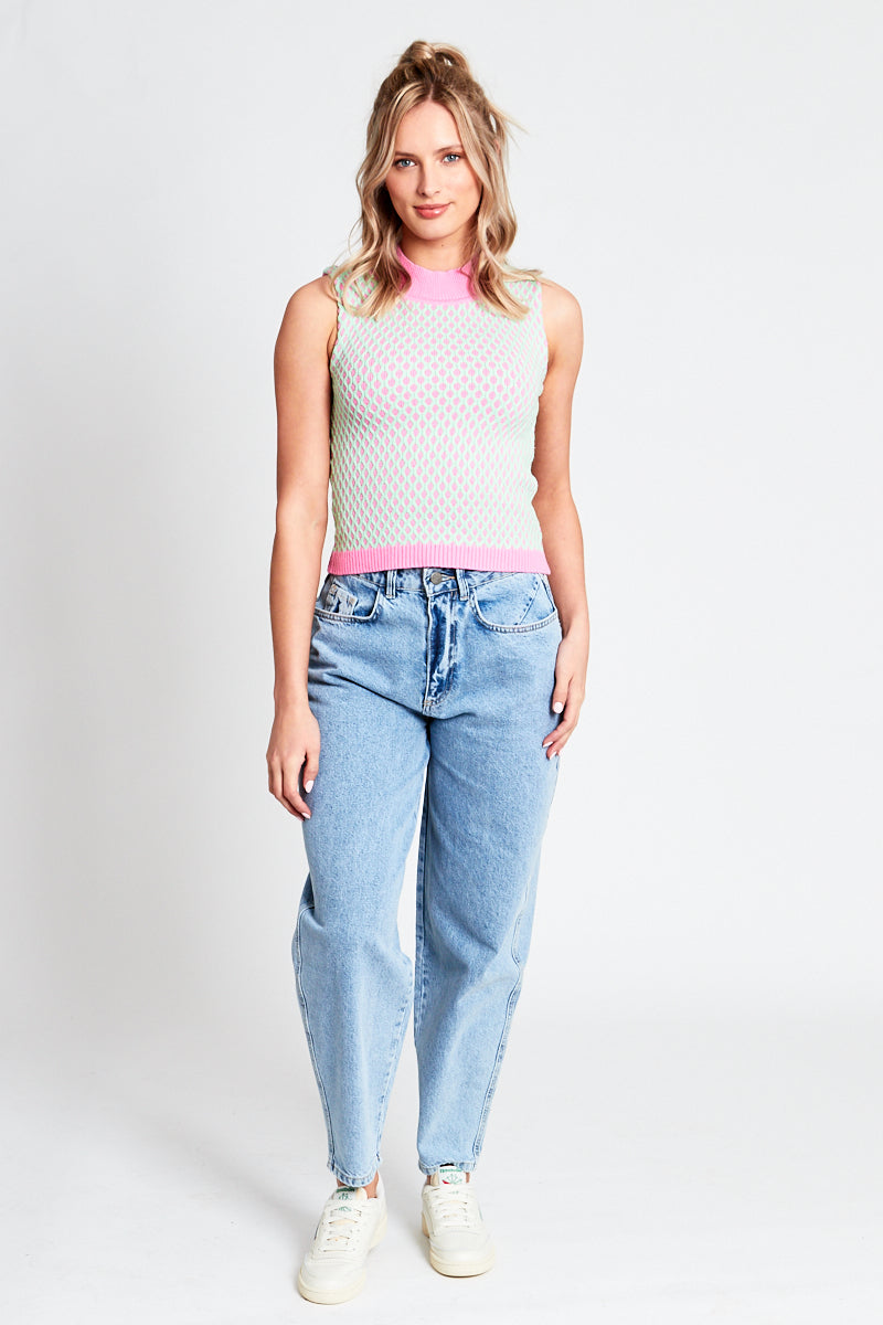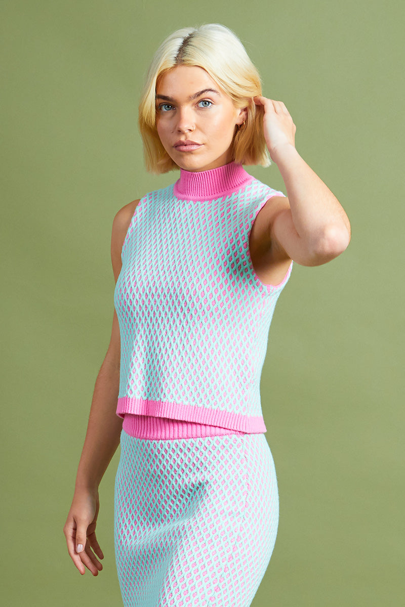 Introducing the Harlow, a sleeveless crop top coming in a raised baby blue knit pattern, with contrasting raised high neck collar and matching hem in a pink colourway.