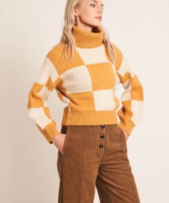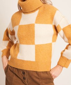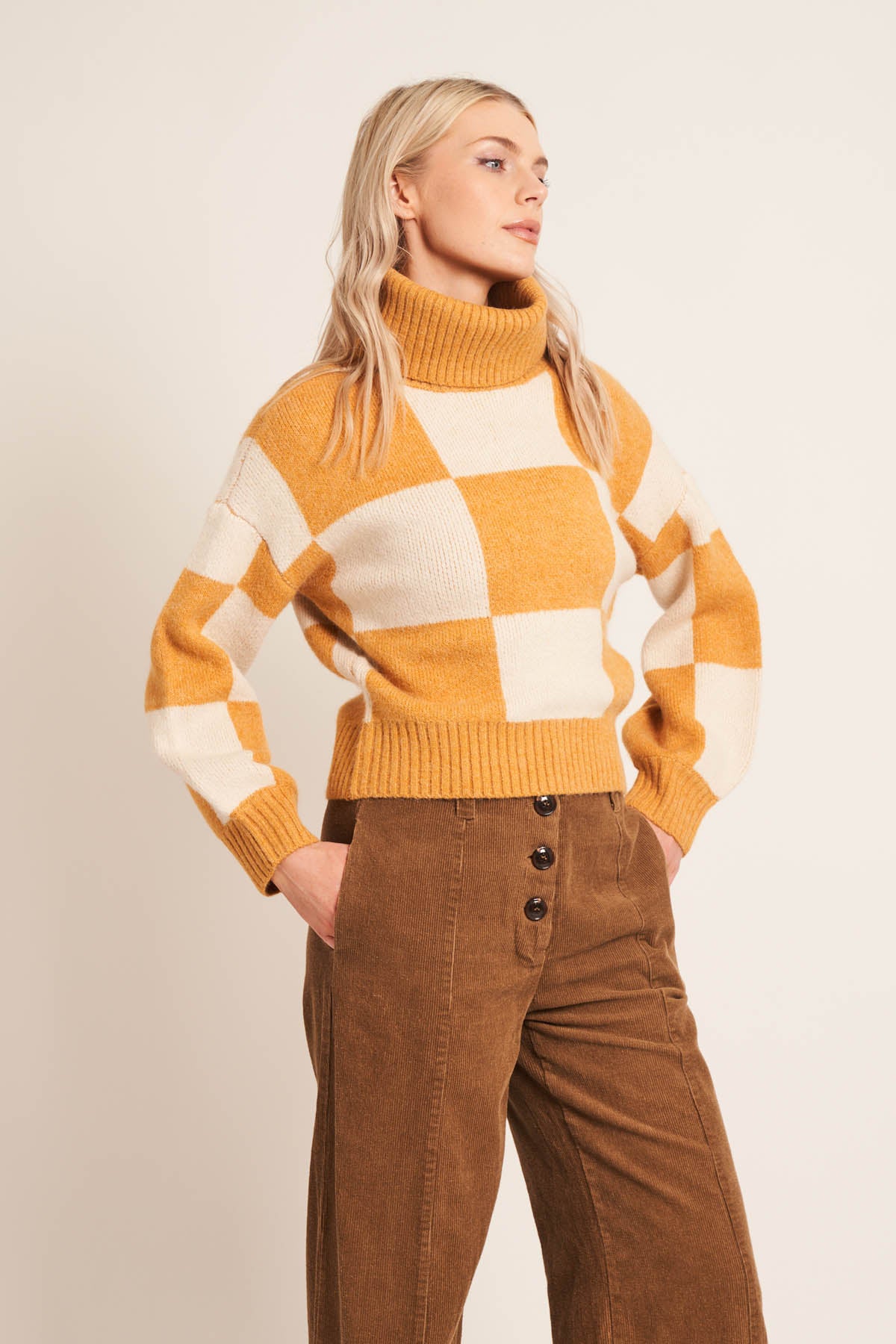 Introducing the Iola knitted jumper, crafted from checkerboard intarsia jacquard with blouson sleeves and roll neck.