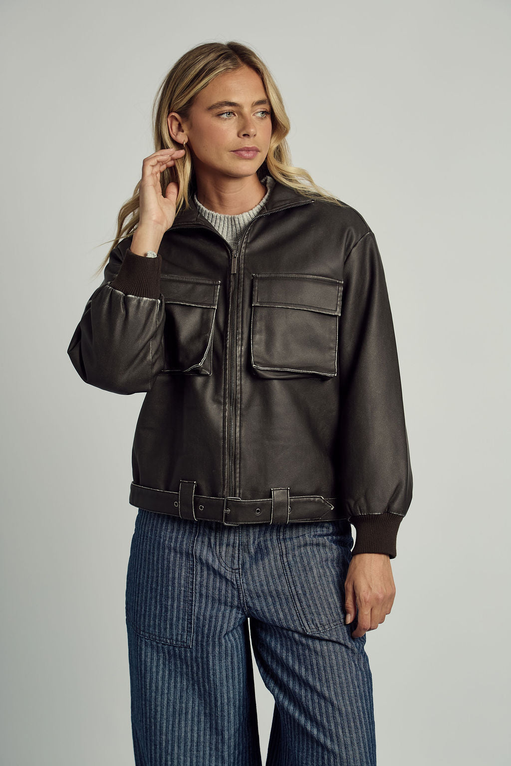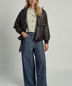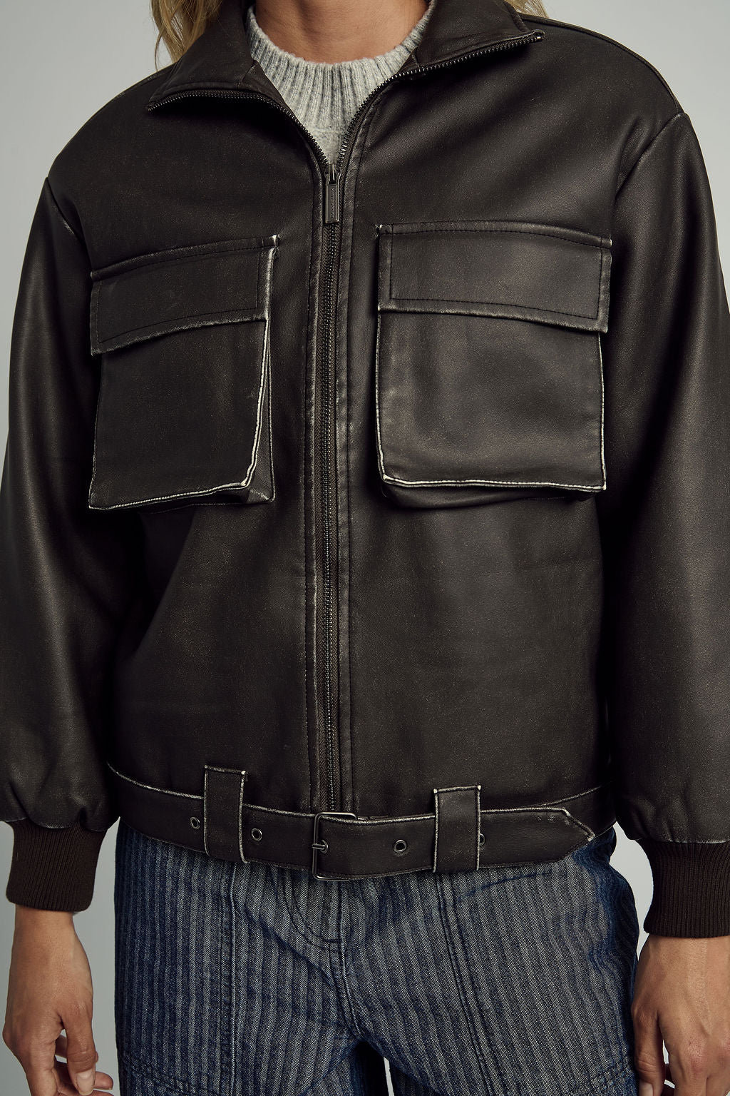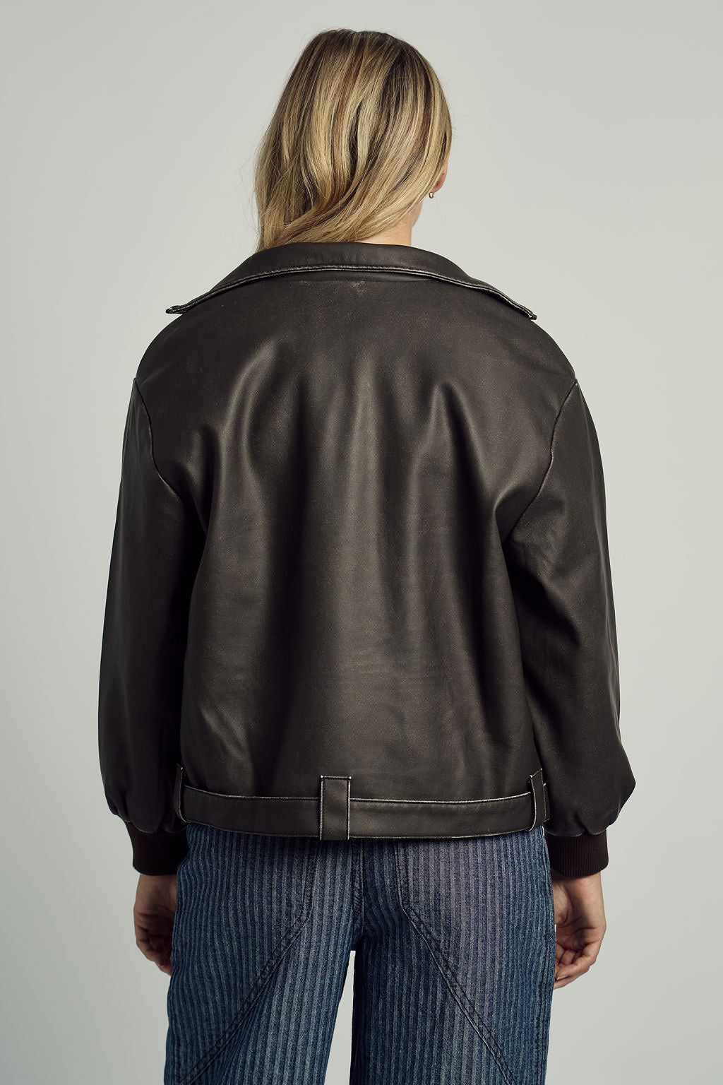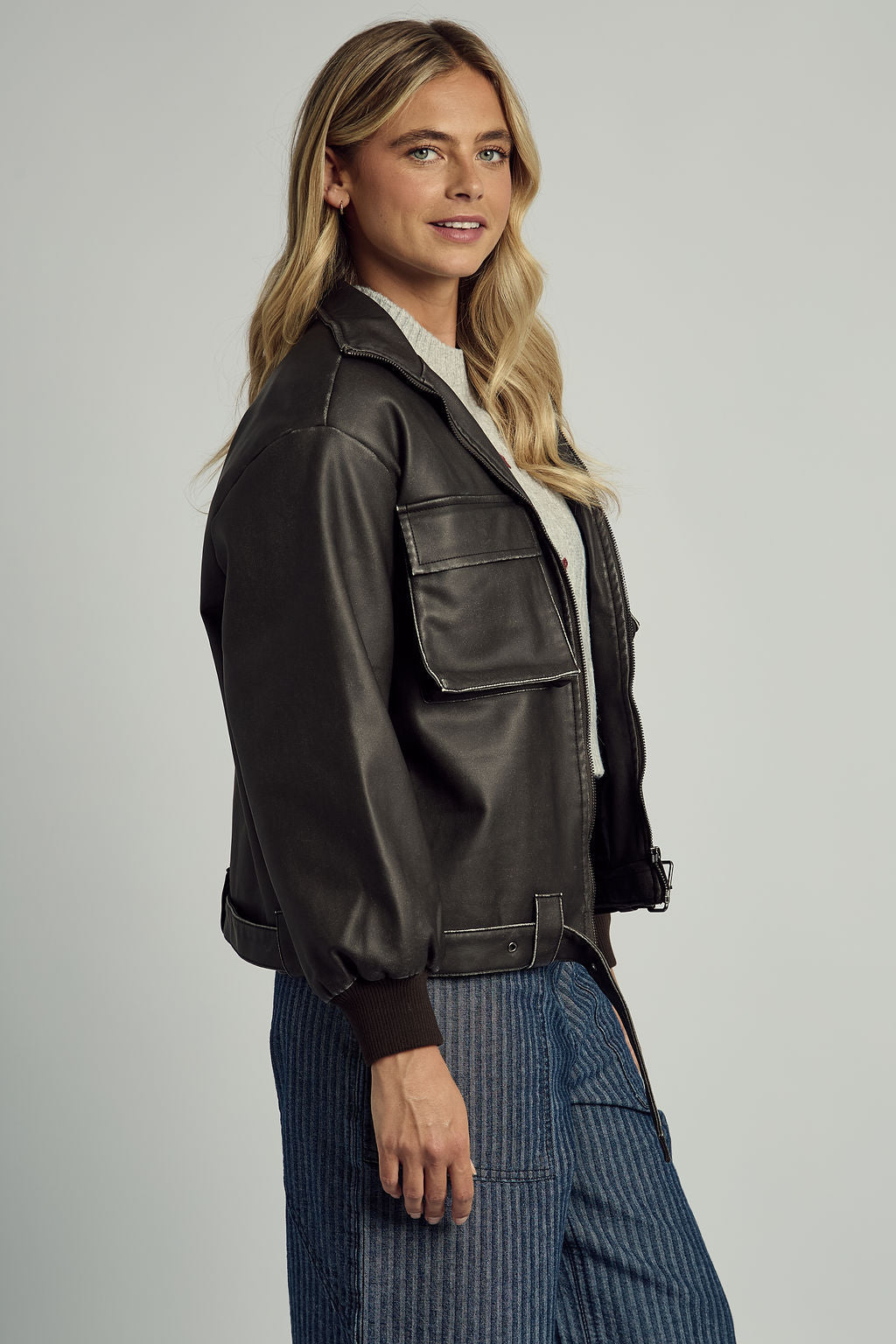 Wear it solo over a crisp tee or layered over knits — the Washed PU Bomber is your statement of understated power and enduring style.