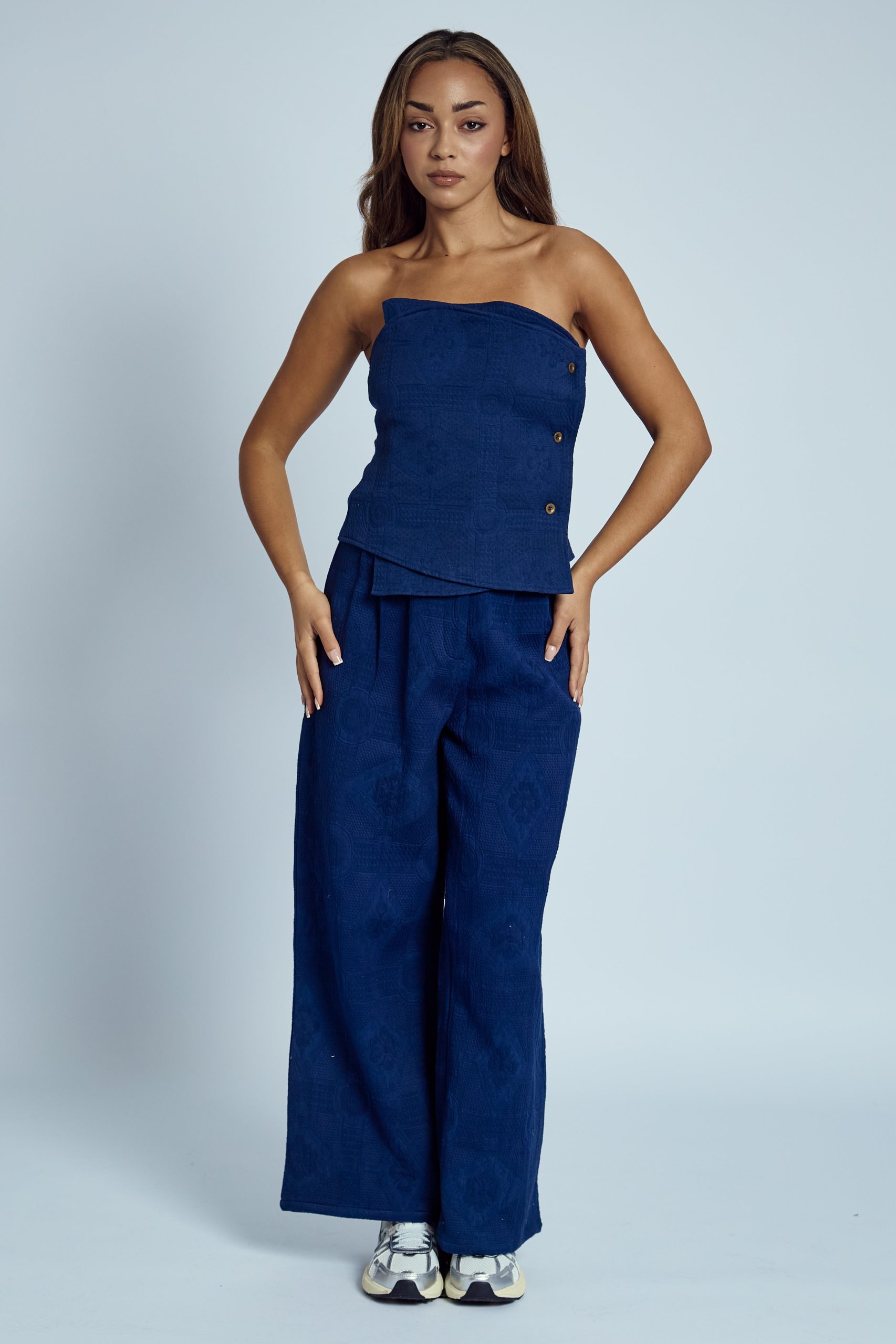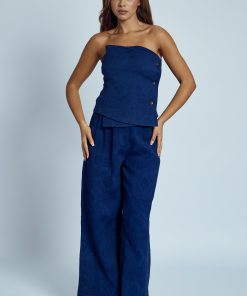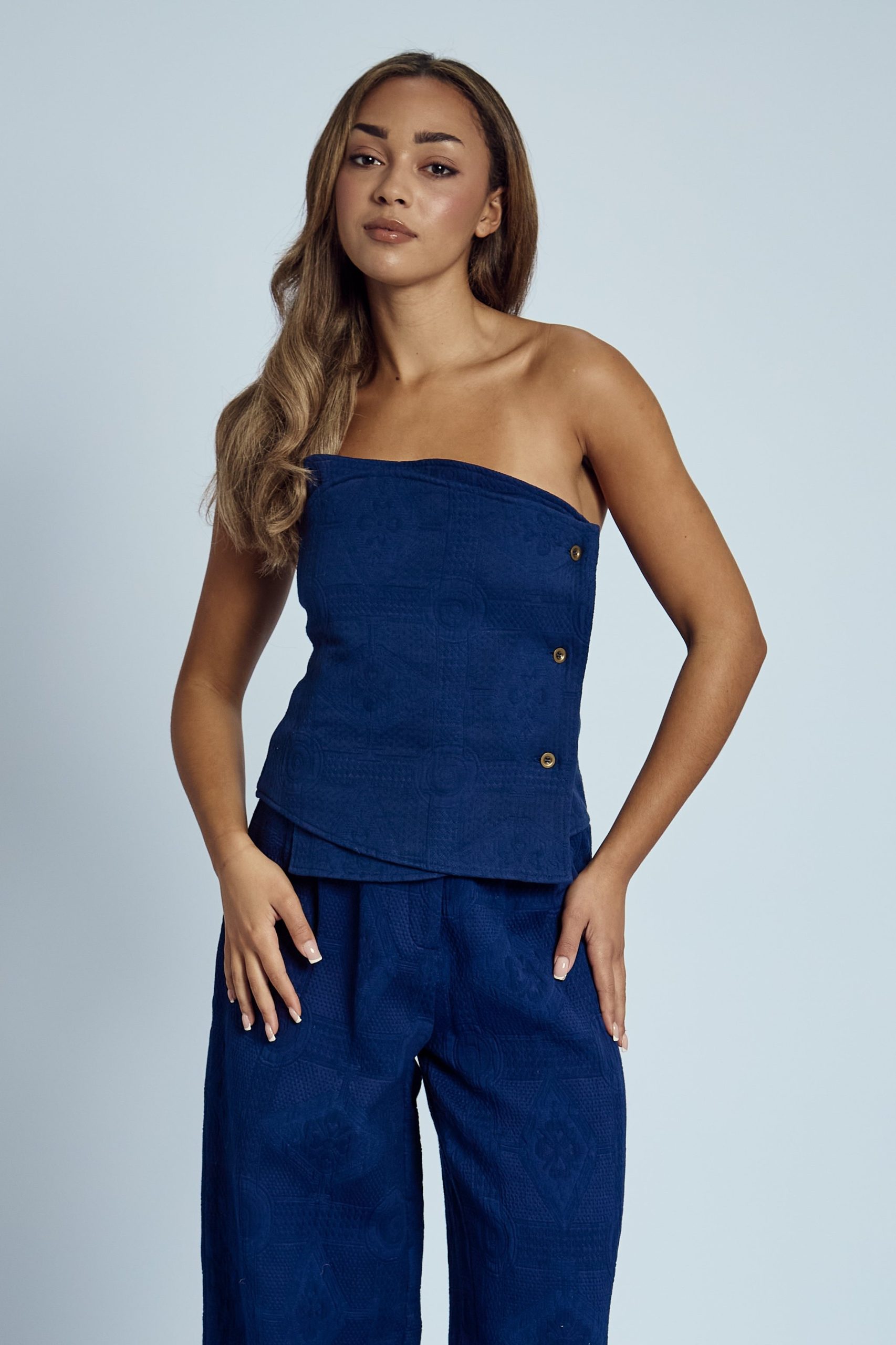 The Katalina Asymmetric Textured Bandeau Top in a striking blue hue redefines effortless chic. Crafted from 100% cotton, its asymmetric design and textured fabric add a modern twist to a classic bandeau silhouette. This fitted top is perfect for pairing with high-waisted trousers or skirts for a sleek, contemporary look.