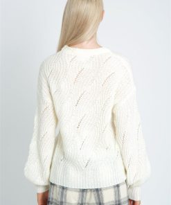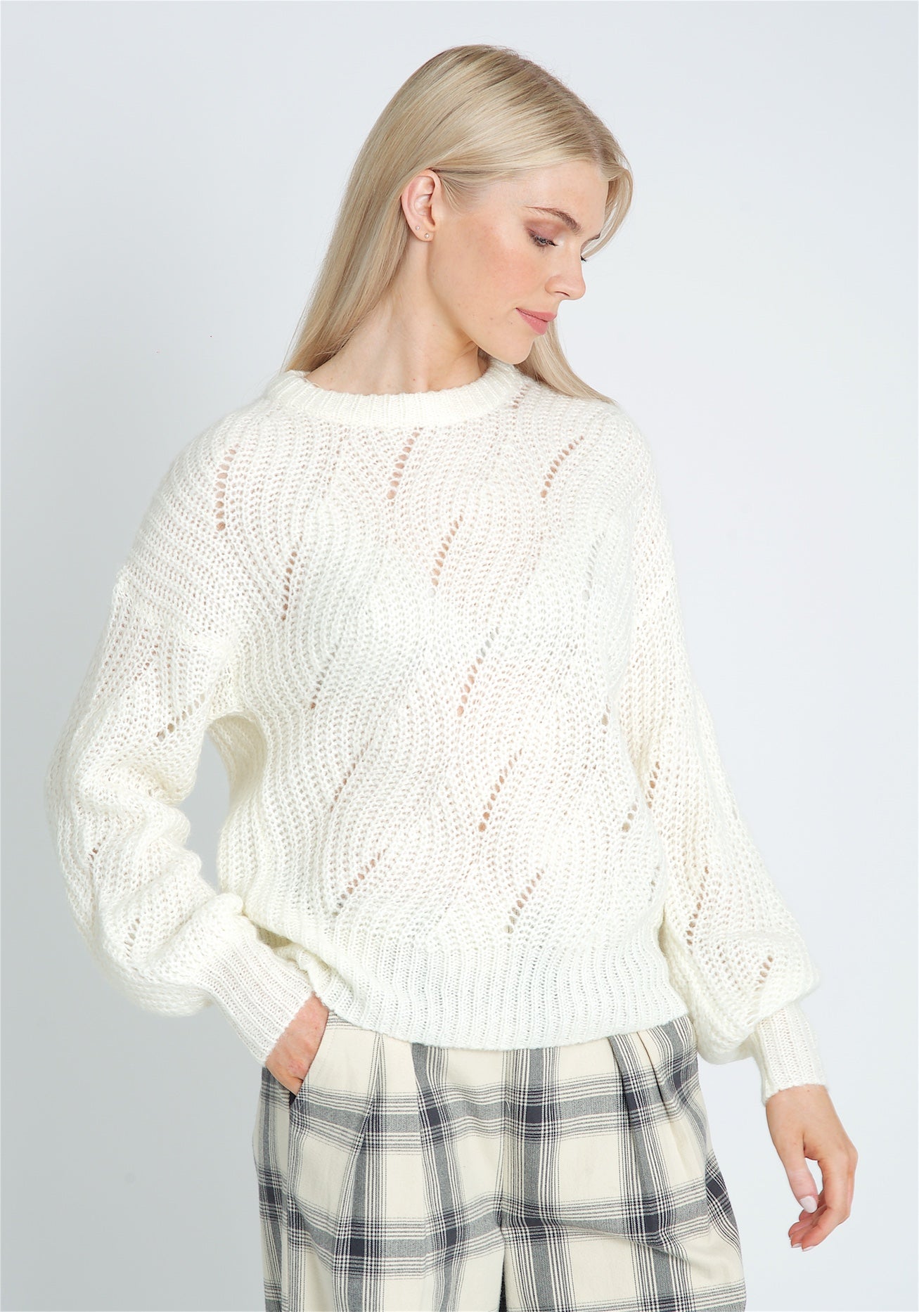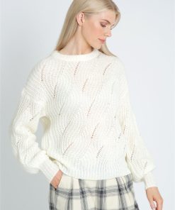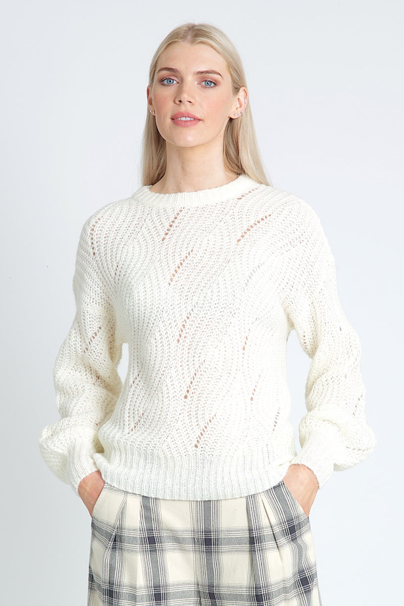 Introducing the Kinsley, a colour upgrade to an AW20 favourite the Delaney comes a statement oversized cable knit jumper in crisp white ivory and finished with balloon sleeves and woven spiral design.