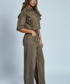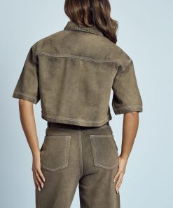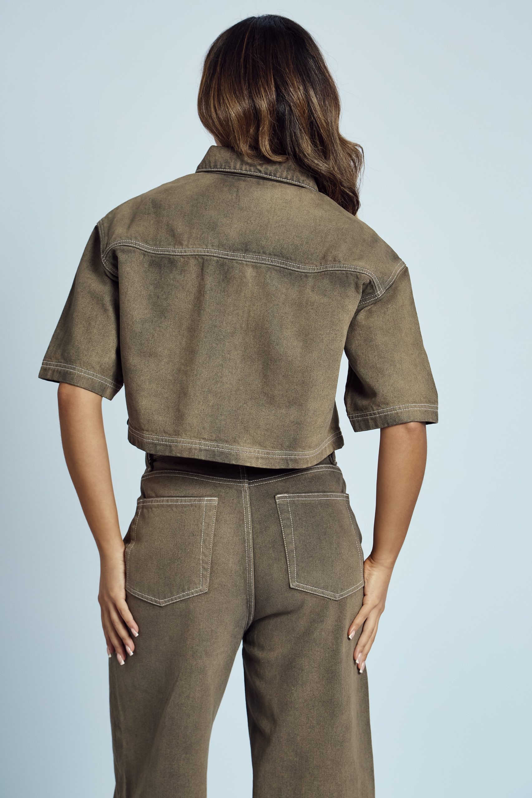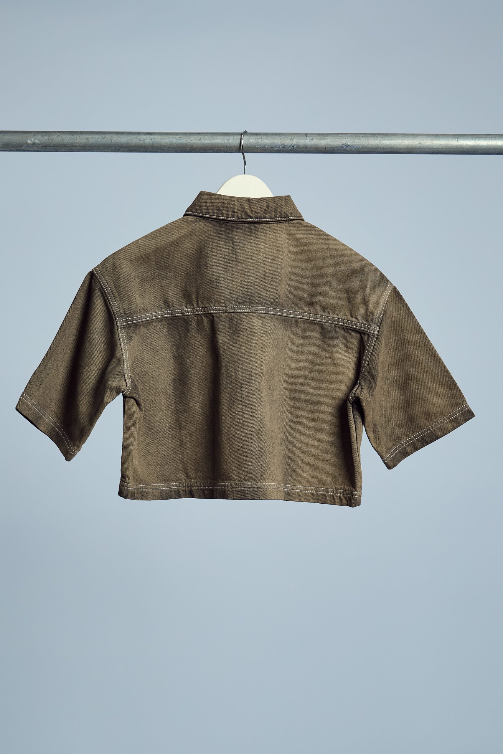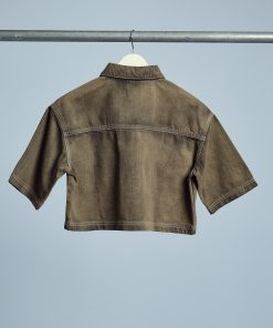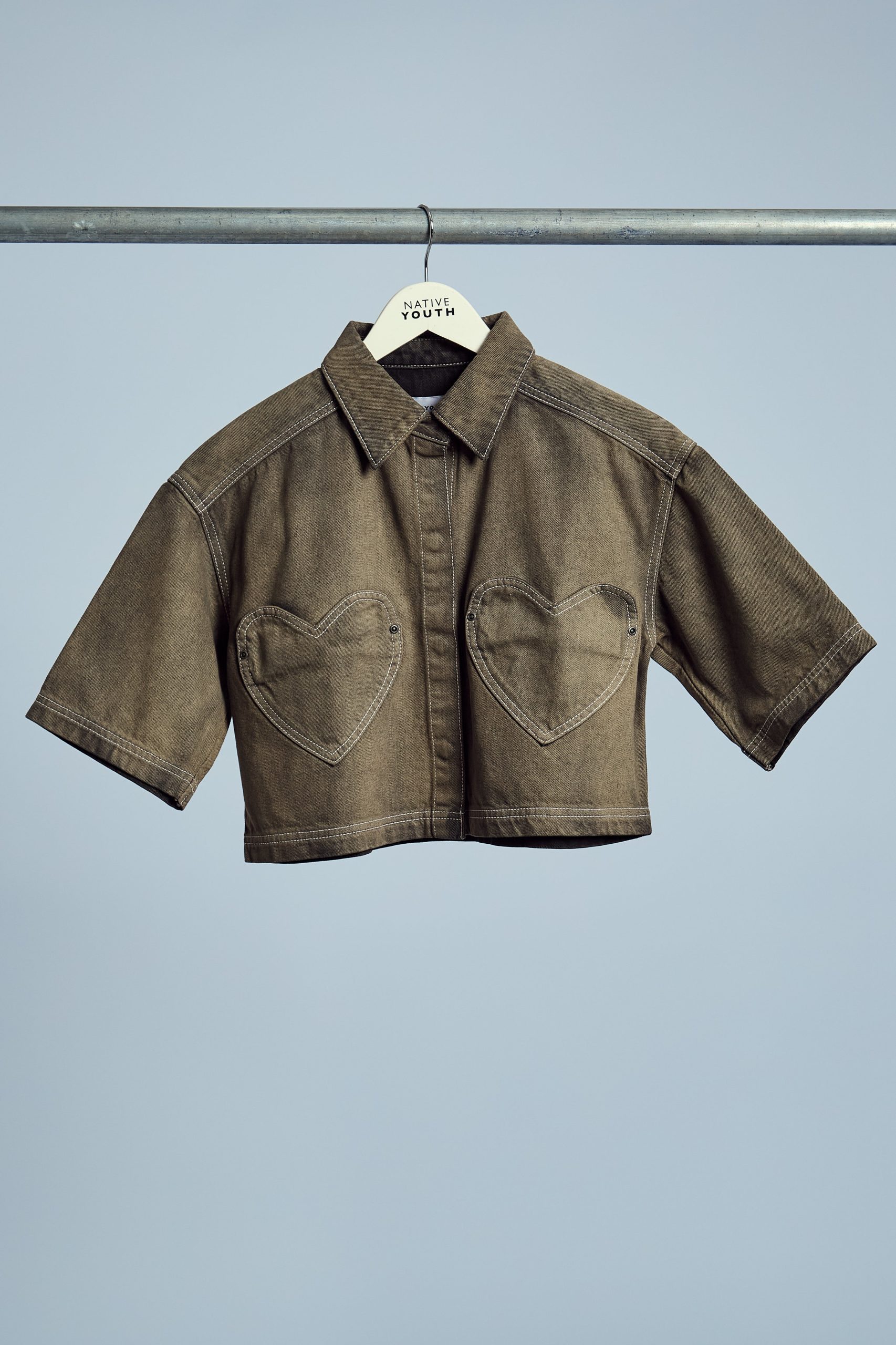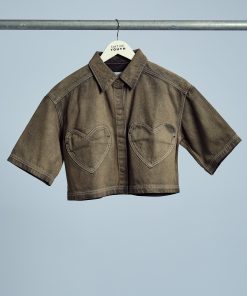 This cropped denim shirt stands out with its playful heart-shaped chest pockets and vintage-inspired acid wash finish. Crafted from 100% cotton, the design features a structured, boxy fit, a classic collar, and short sleeves, making it an ideal layering piece. The unique heart pocket detailing adds a touch of femininity to this bold, casual look.