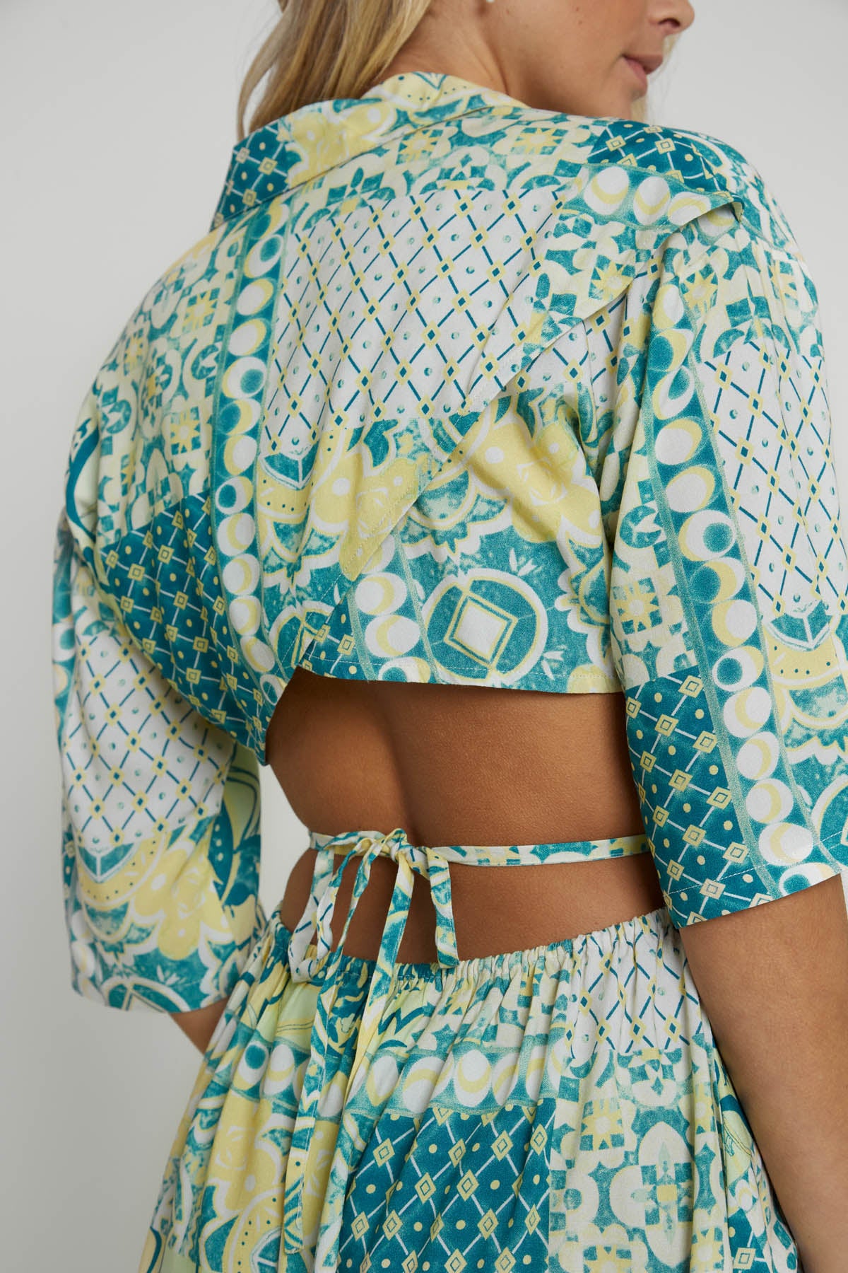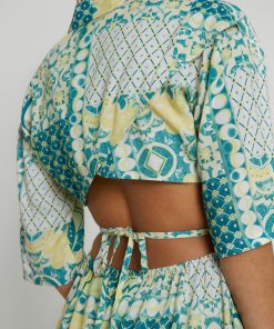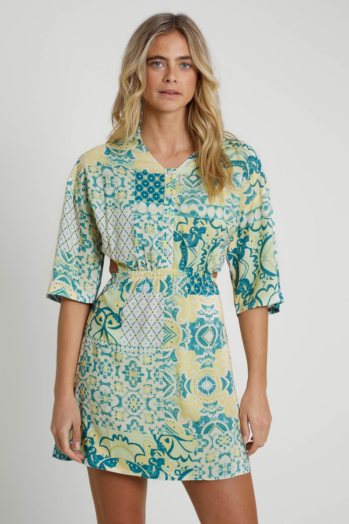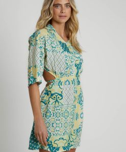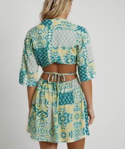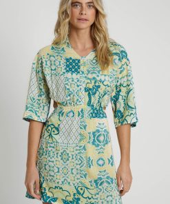 The Lavera Mini Shirt Dress combines a green tile print with eco-friendly Ecovero viscose fabric. This relaxed-fit dress features a collar with V-neck, half placket button fastening, tie front waist, and wrap back detail, culminating in an open back with elastic gathering.