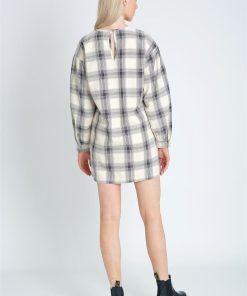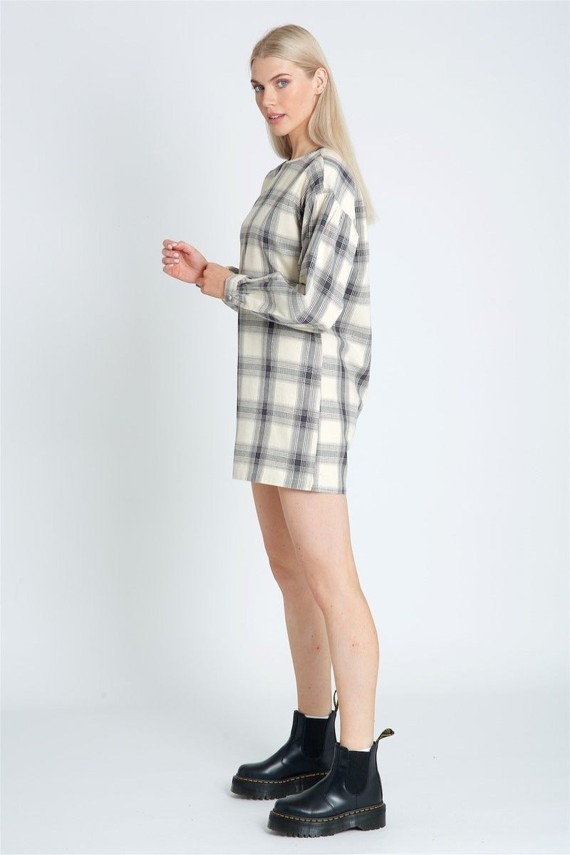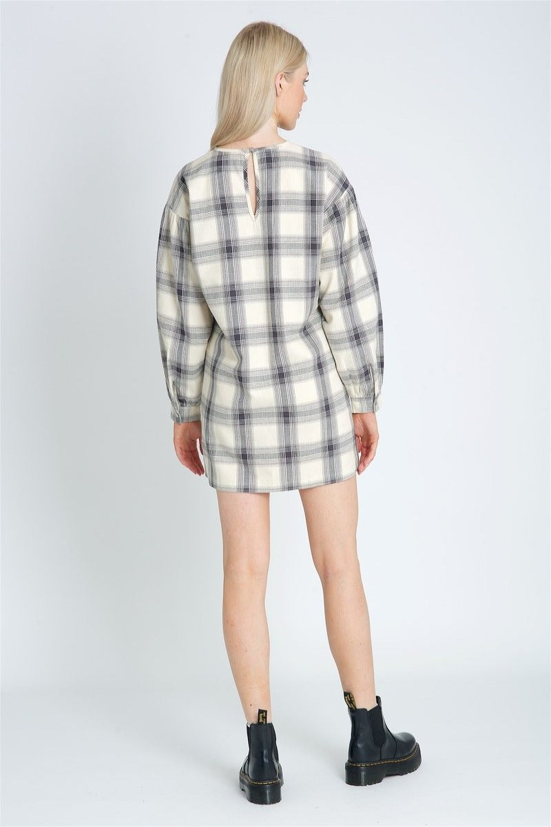 Introducing the London, part of our checked set, in ivory of our key colours for the autumn/winter season. Comes in a short dress silouhette with dropped shoulder features and puffed sleeves.