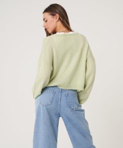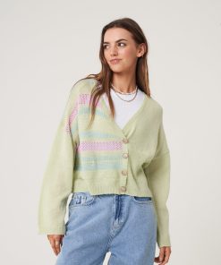 Introducing the Louella, a wrap-over cardigan with wooden horn button fastening, contrasting stripe stitch detail in seasonal pastel colours. Pair up the Louella with your favourite denim or wide-leg pant for a casual spring look.