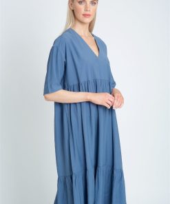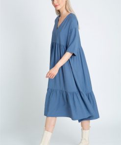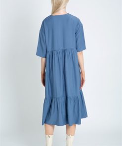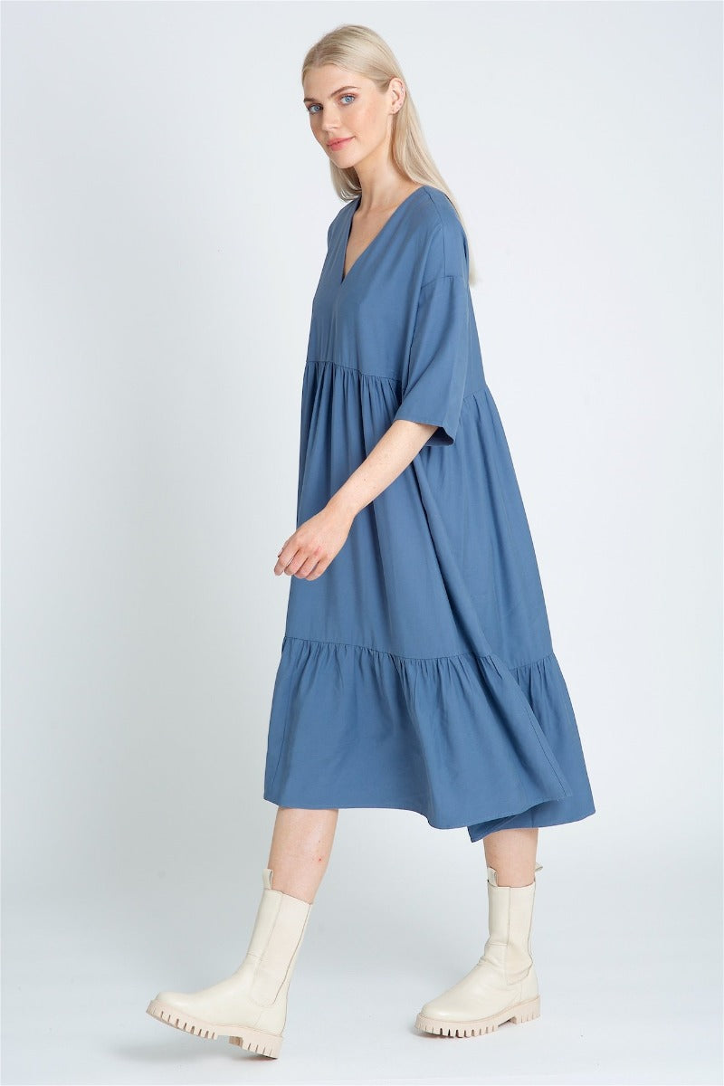 Introducing the Melody, a v neck style tiered dress constructed from sustainable tencel fabrics. Layered in a sky blue colourway.
