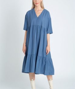 Introducing the Melody, a v neck style tiered dress constructed from sustainable tencel fabrics. Layered in a sky blue colourway.