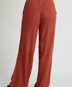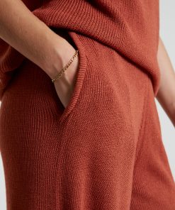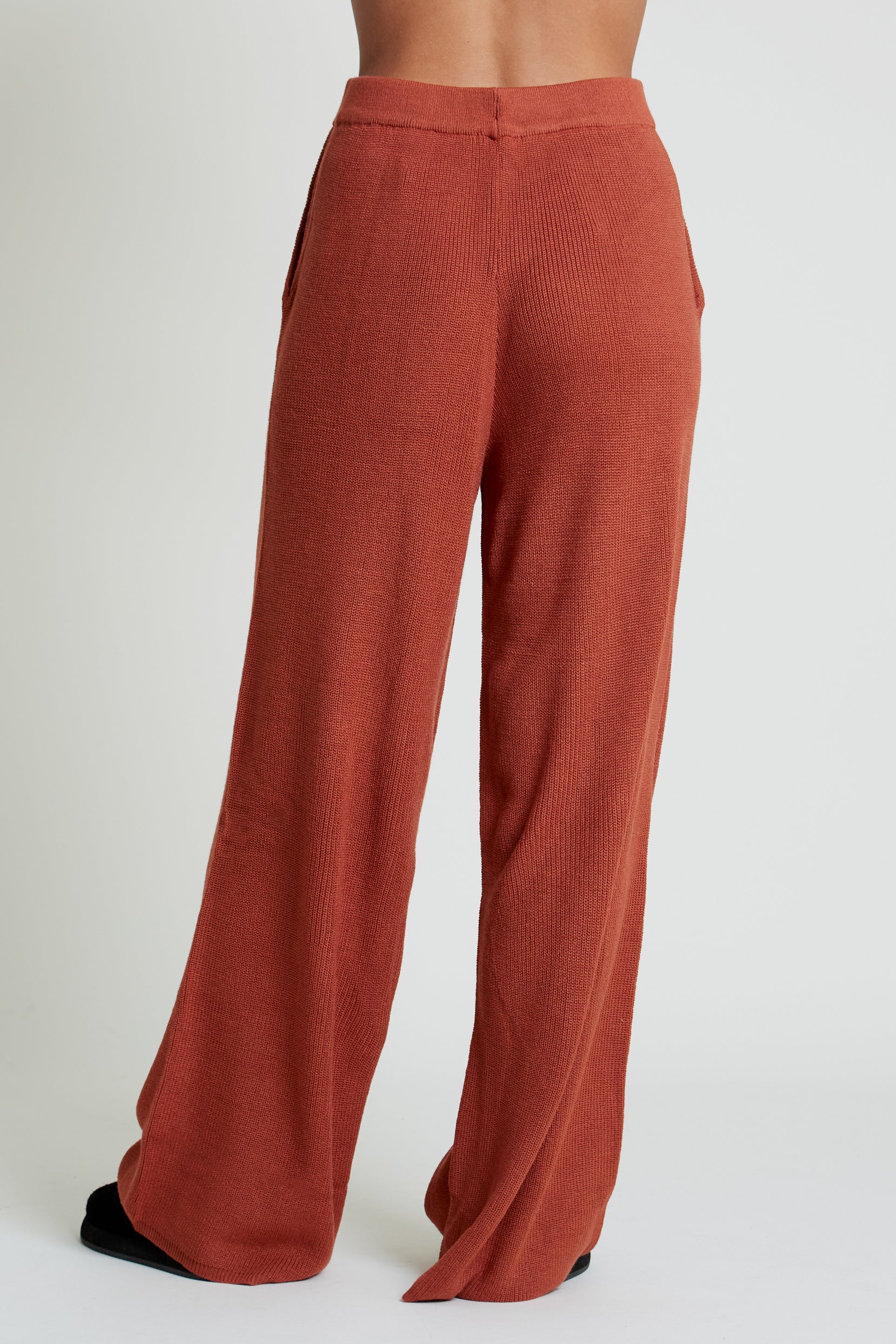 Introducing the Mila, a knitted pant in a fiery rust colourway. Designed with a wide leg opening and front-facing kangaroo pockets, for a flowy relaxed fit.