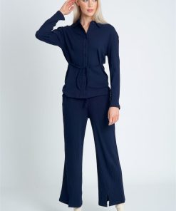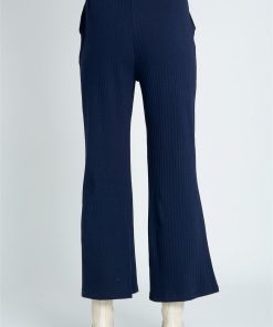 Introducing Molly, a wide leg pant with split hem in navy jersey rib with self-tie waist. Pair it with the matching blouse to complete the co-ord.
