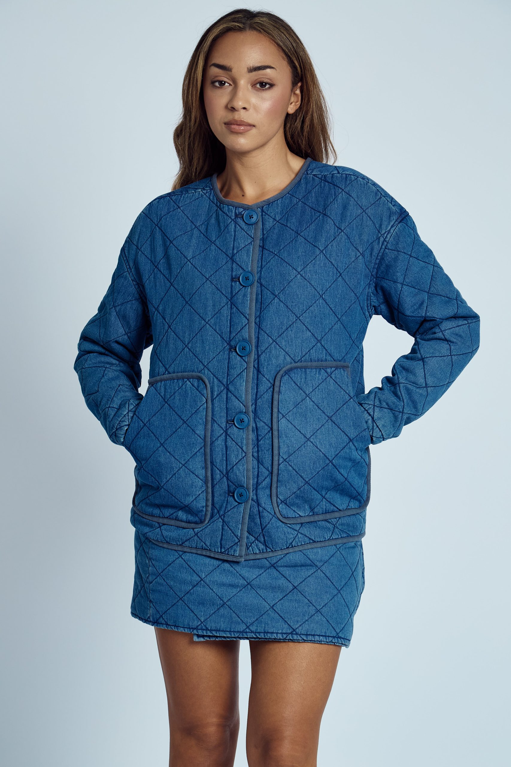 The Nadia Quilted Washed Jacket in a striking blue hue combines practicality with modern flair. Made from 100% cotton and detailed with nylon trims, this relaxed-fit jacket features a washed quilted texture that adds dimension and a contemporary edge. Perfect for layering over casual or elevated outfits, it’s your go-to for cooler days.
