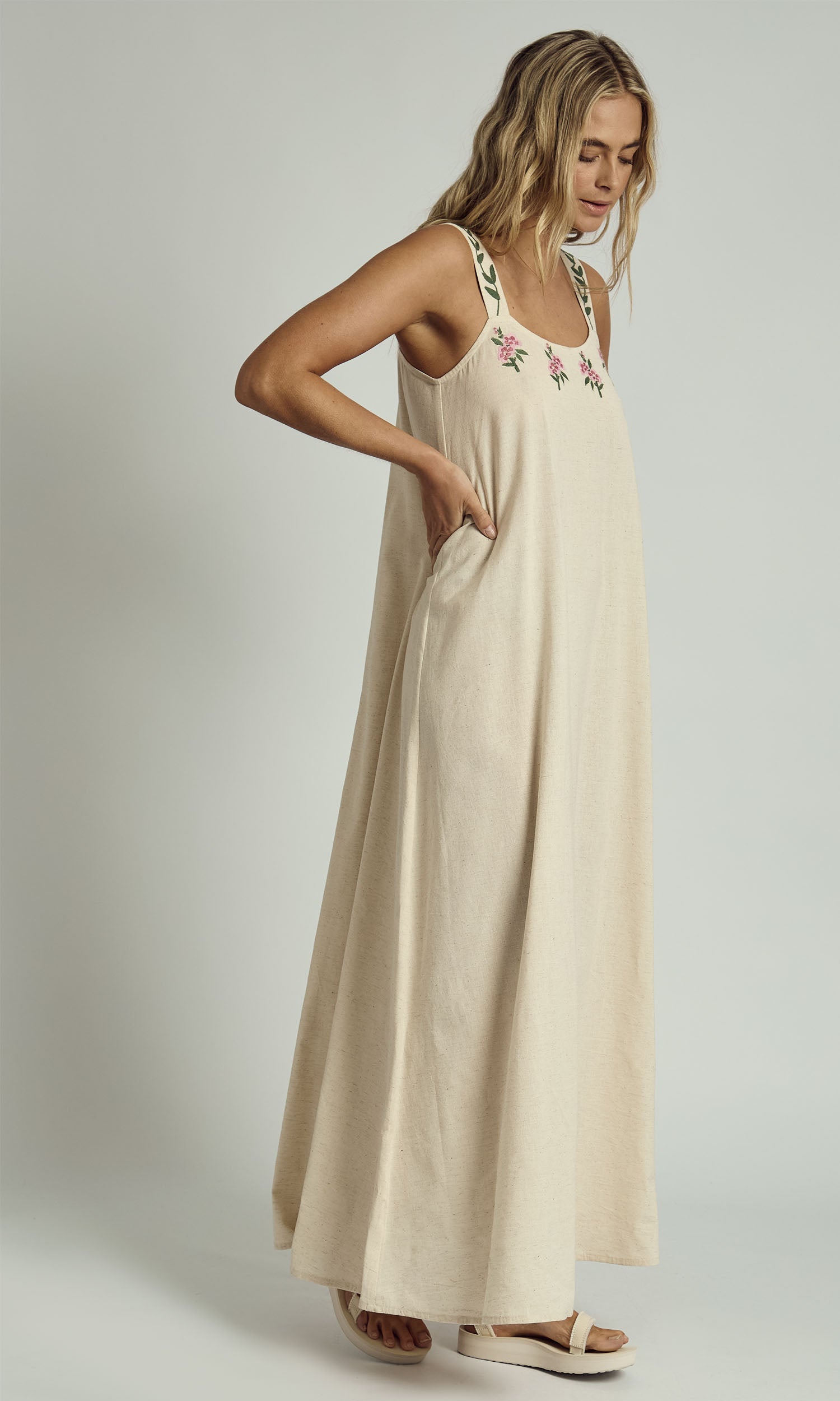 NIA EMBROIDERED EDGE LINEN MAXI DRESS IN STONE