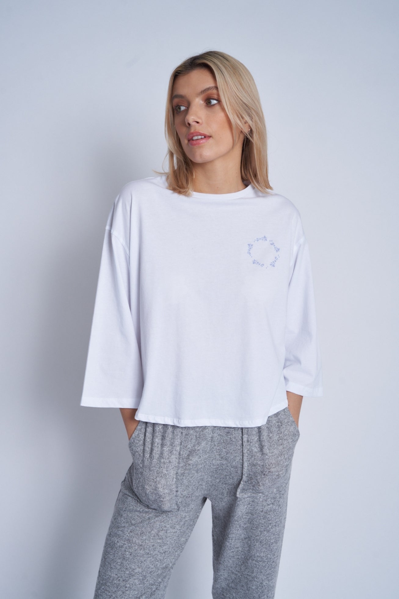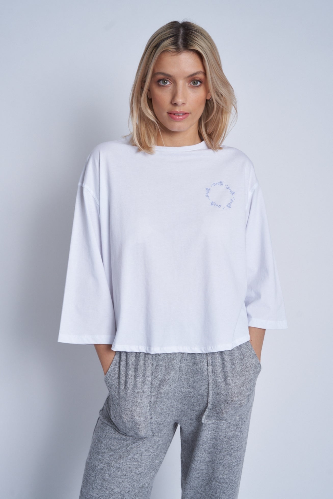 Introducing the Palmarosa cropped boxy t-shirt made from 100% cotton, with statement circular youth logo at the chest. The perfect match for a pair of joggers to complete your loungewear look.