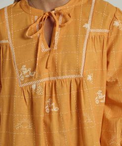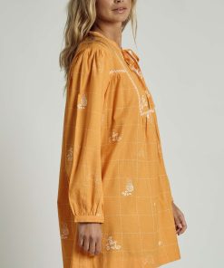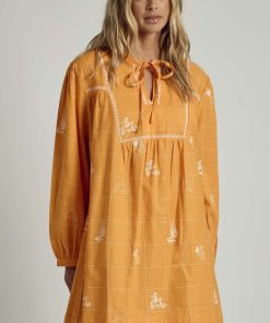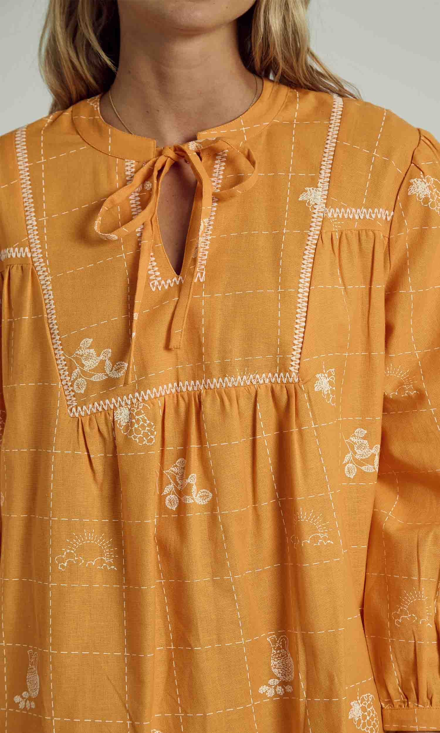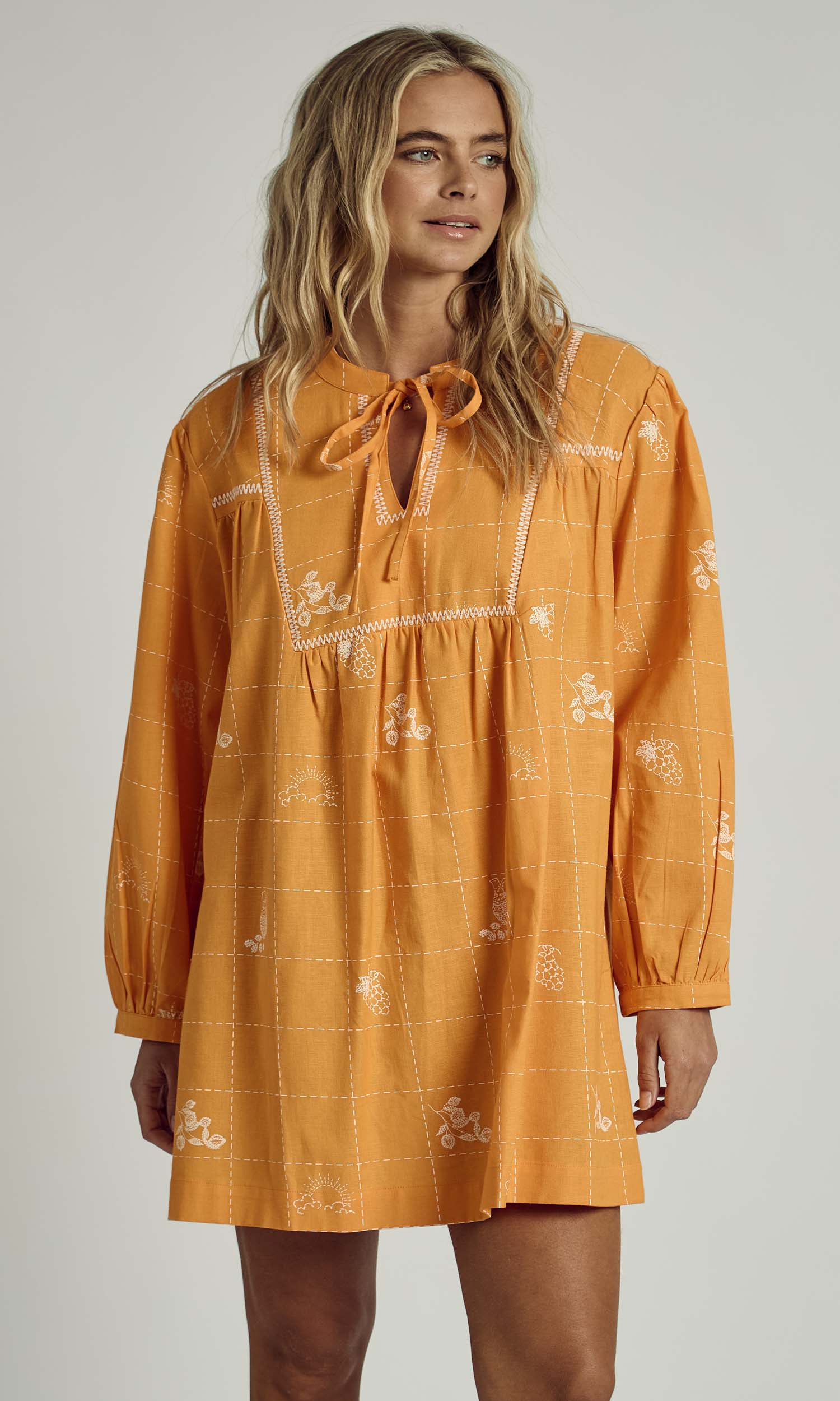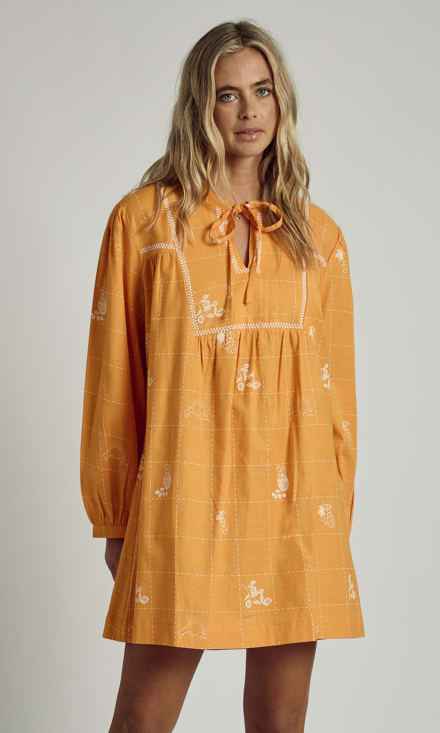 PATCHWORK SOLSTITCHERY MINI SMOCK DRESS IN ORANGE