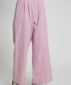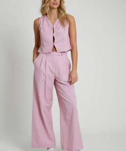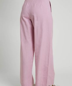 These elegant purple trousers are made from a linen blend and feature a wide-leg design. The zip fly and hook-and-eye fastening at the waist, along with front pleats and slip pockets, combine functionality with a stylish flair.