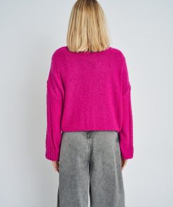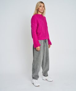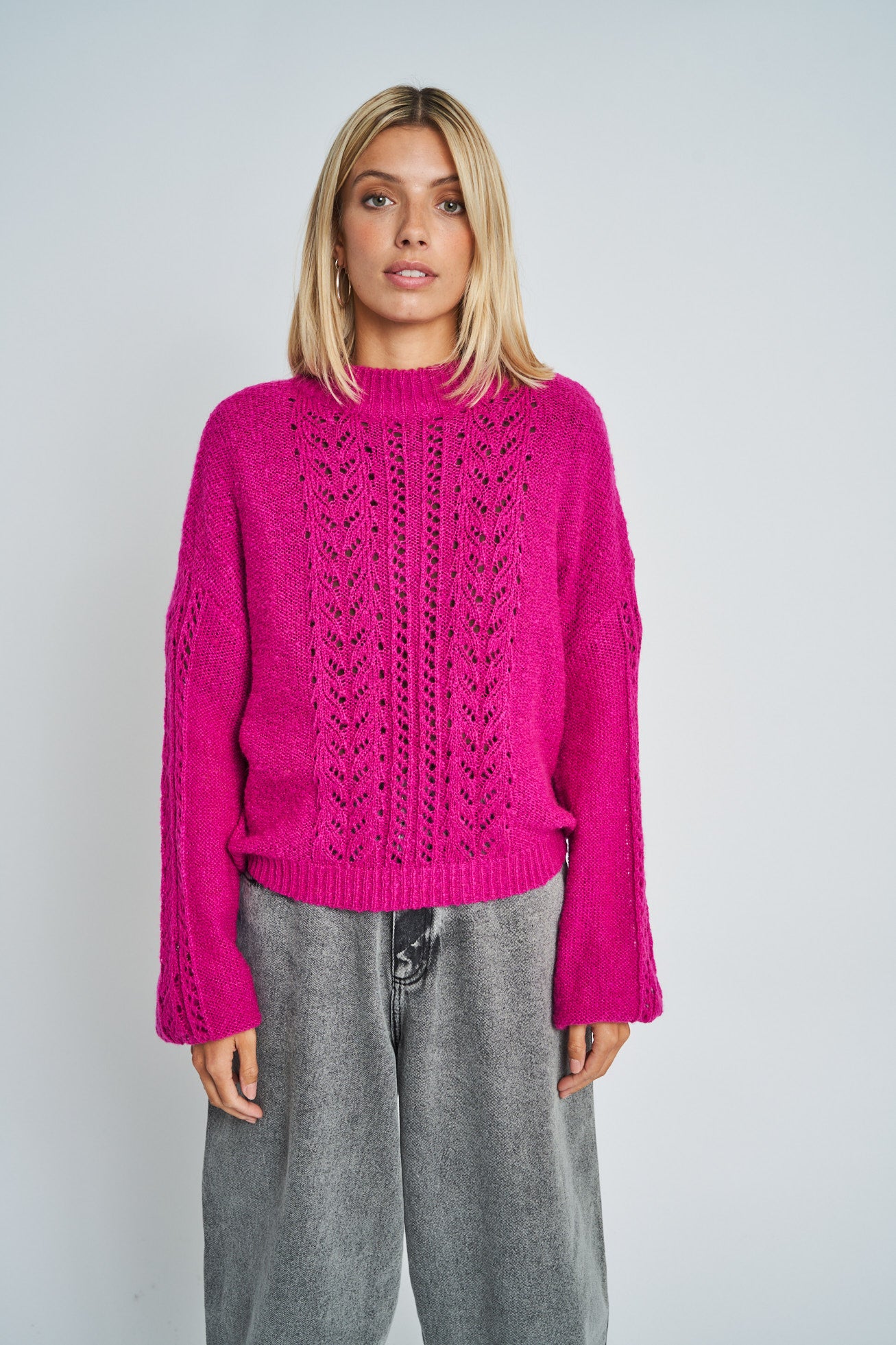 Introducing the Priya Knit a carefully knitted jumper in a punchy pink colourway with cable detailing throughout and on sleeves