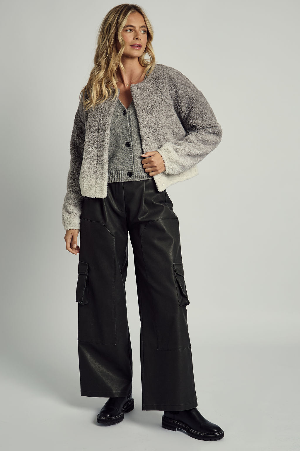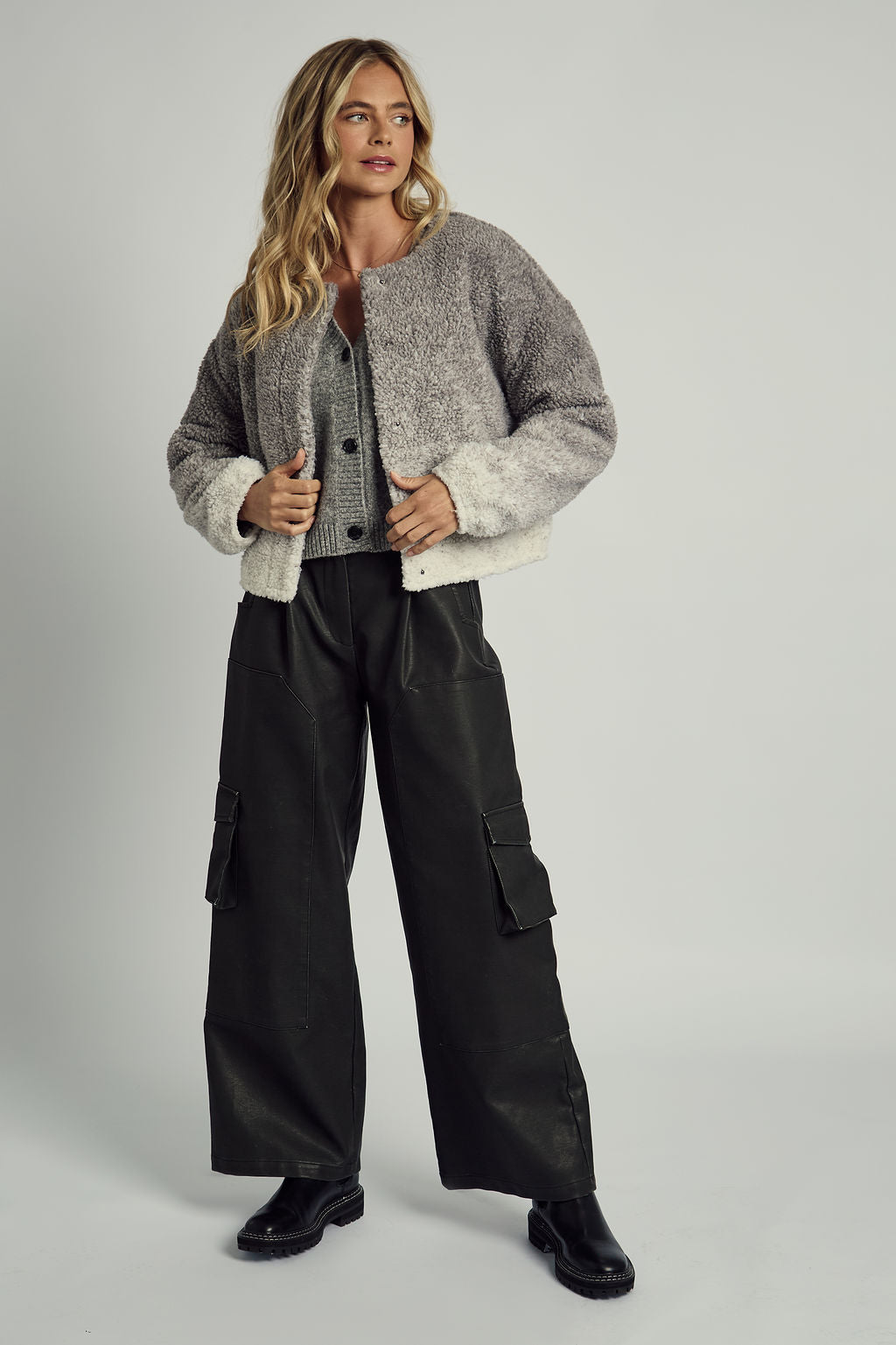 The Sears Ombre Borg Cropped Jacket in grey is a cozy, stylish layer with a subtle ombre effect that adds depth and interest to any outfit. Made from plush borg fabric, this jacket offers both warmth and texture, while the cropped fit brings a modern twist to a classic winter staple.
