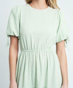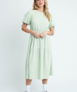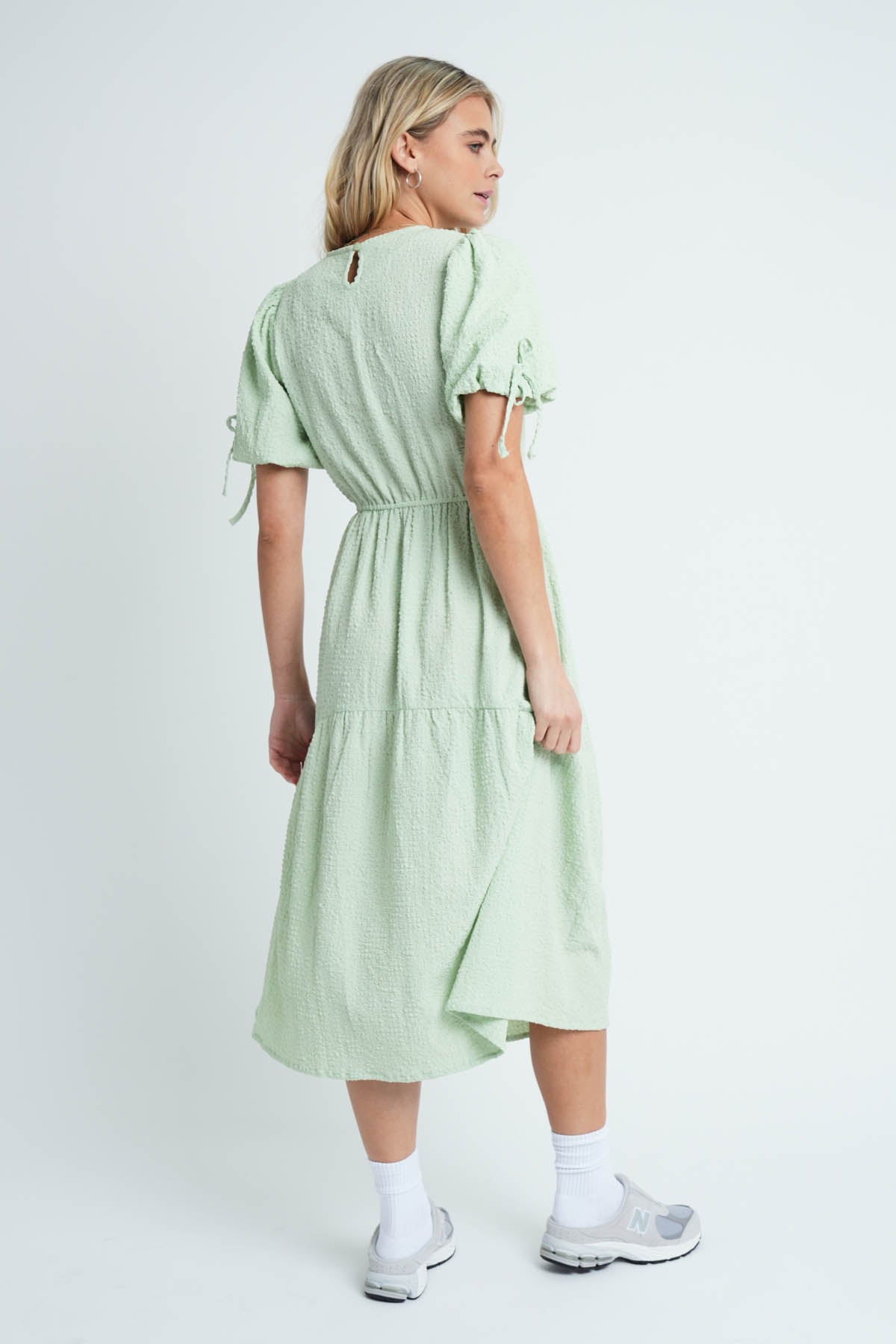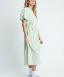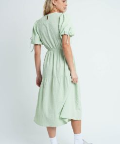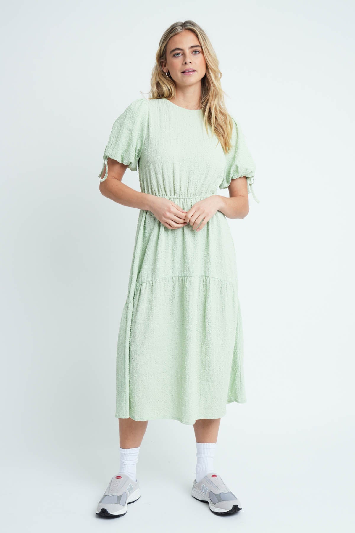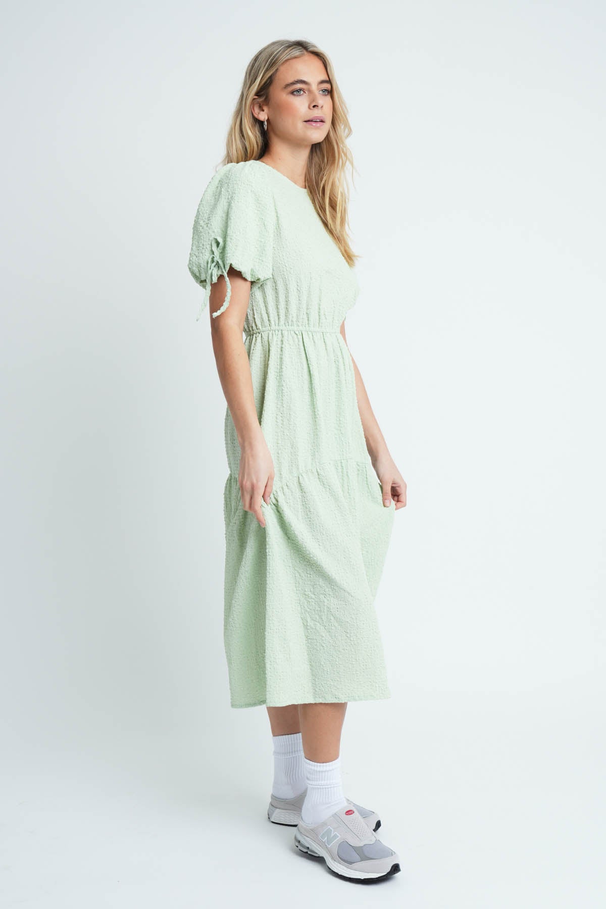 The Terti dress is characterised with textured seersucker striped fabric, short sleeves and tiered hem.