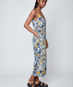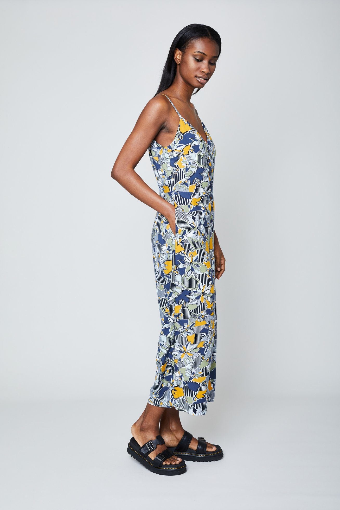 The Geo Flora Cami Jumpsuit comes in an all over print with cami straps and culotte leg. The jumpsuit features a V front and low back. Finished with front button detailing and side pockets.