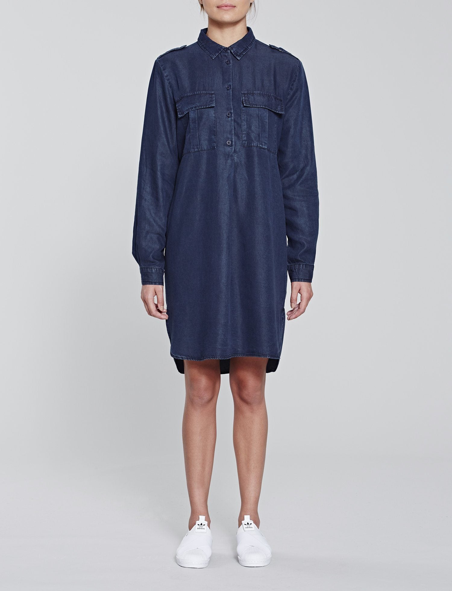 The half placket indigo dyed shirt dress featuring a curved hem, cargo chest pockets and shoulder detailing.