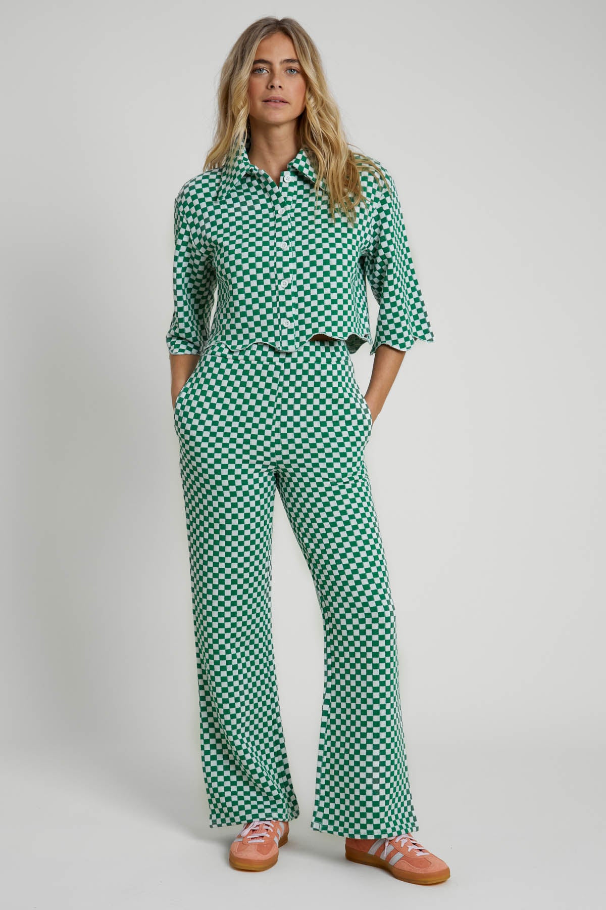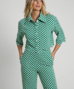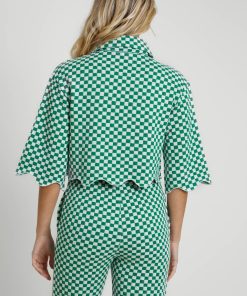 Discover the charm of the Wivi Jersey Gingham Jacquard Shirt, presented in a refreshing green. This shirt marries comfort with style, featuring a practical button front fastening for ease of wear. The half sleeves add a modern, relaxed touch, suitable for various settings. Its standout feature, the scalloped hem edge, infuses a playful yet sophisticated element into the design. Crafted from soft jersey jacquard fabric, it promises both durability and comfort. The pointed collar contributes to its classic appeal, making it a versatile addition to your wardrobe. Designed with a relaxed, cropped fit, this shirt offers a contemporary silhouette that flatters and provides comfort. Ideal for pairing with high-waisted jeans or skirts, the Wivi Shirt is a must-have for those who seek a balance of trendiness and timeless elegance.